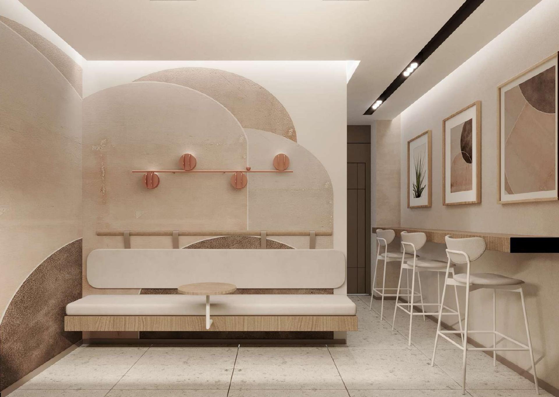 Bekleme ve Sosyal Alanlar: Bekleme bölümü için mekâna özel ölçülerde üretilen, kendinden sehpalı ahşap/kumaş oturma grubu ve duvar dekorasyon panelleri.