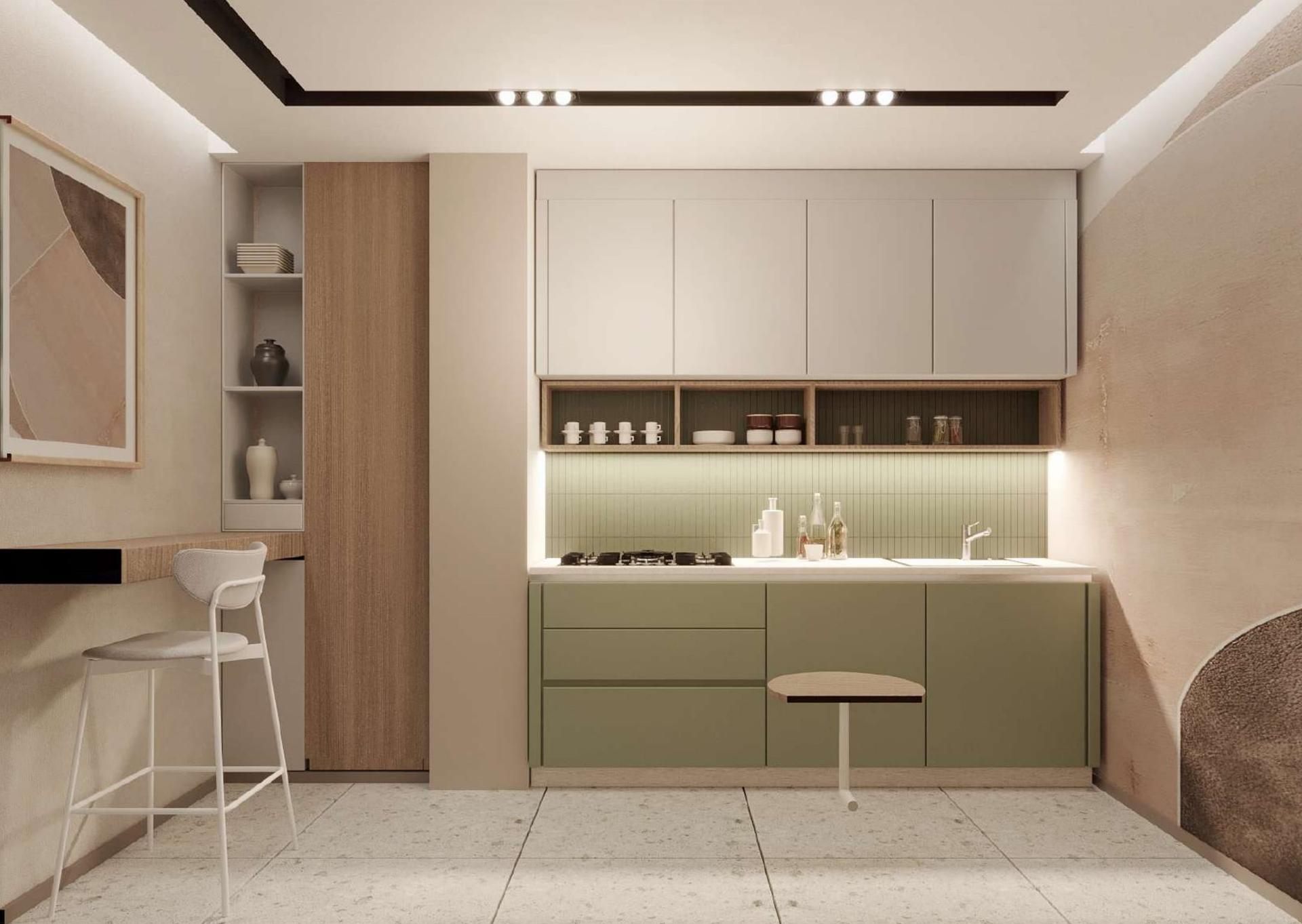 Personel Alanı / Mutfak: Adaçayı yeşili ve mat beyaz lake kombinasyonlu, açık raf sistemli mutfak dolapları ve bar tipi oturma alanı imalatı.