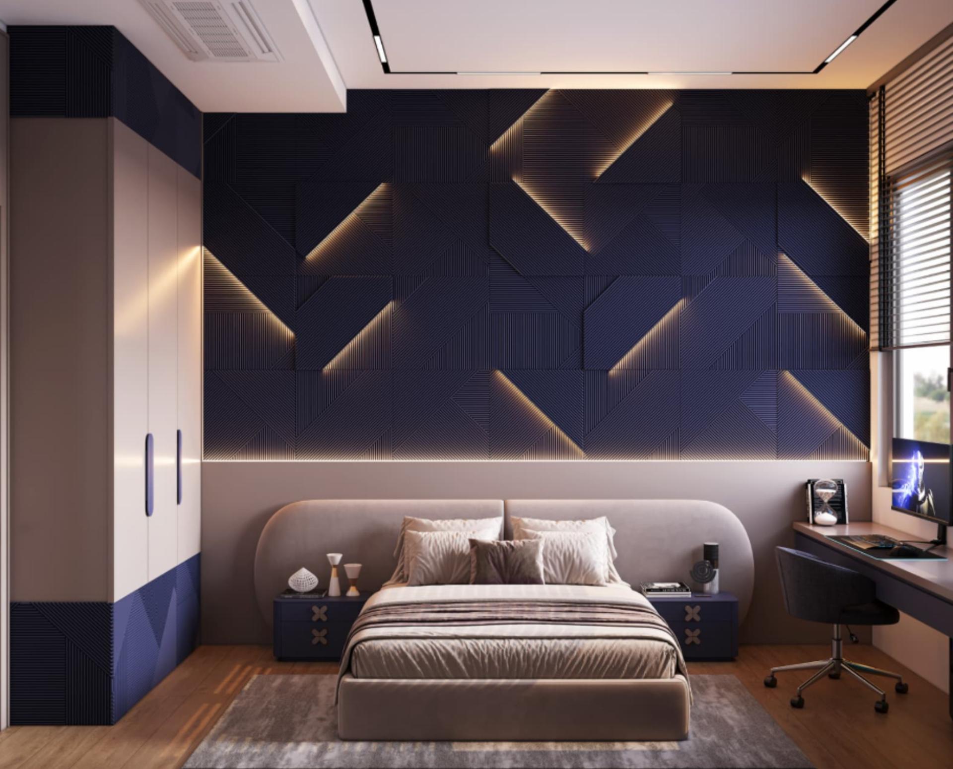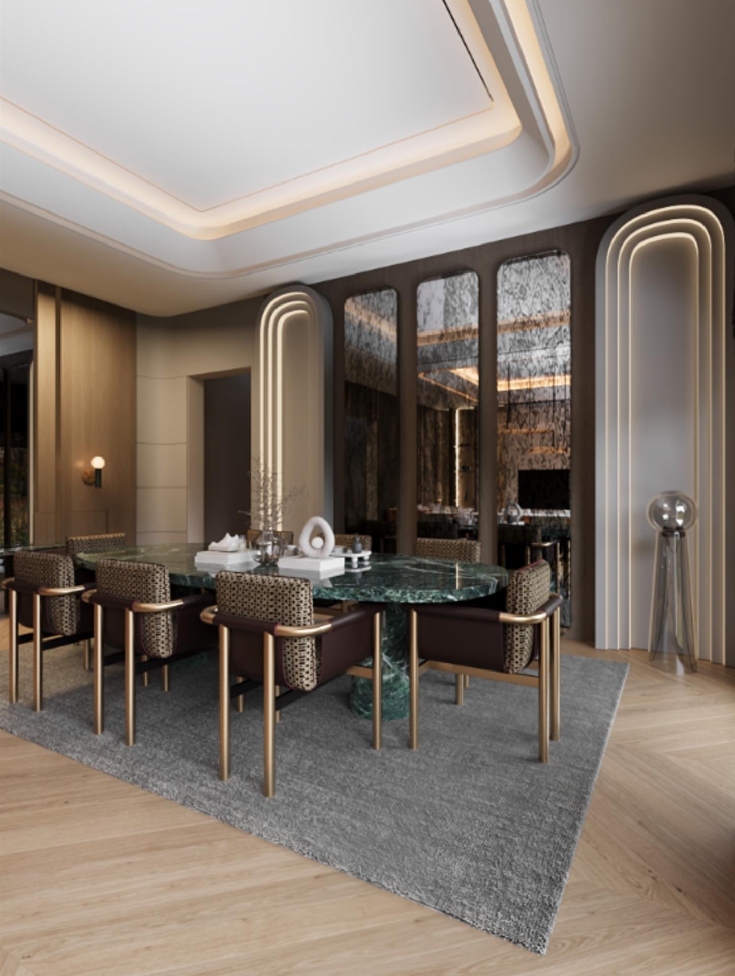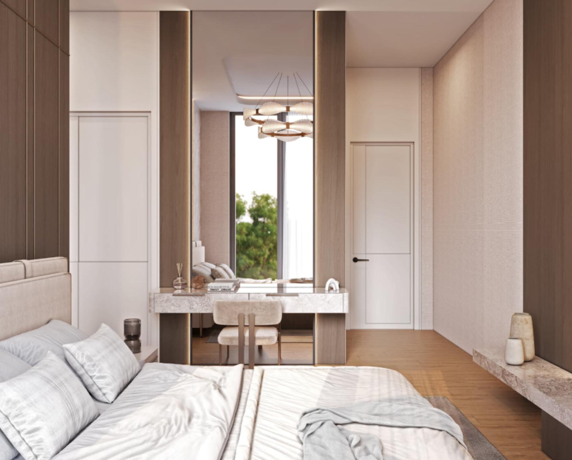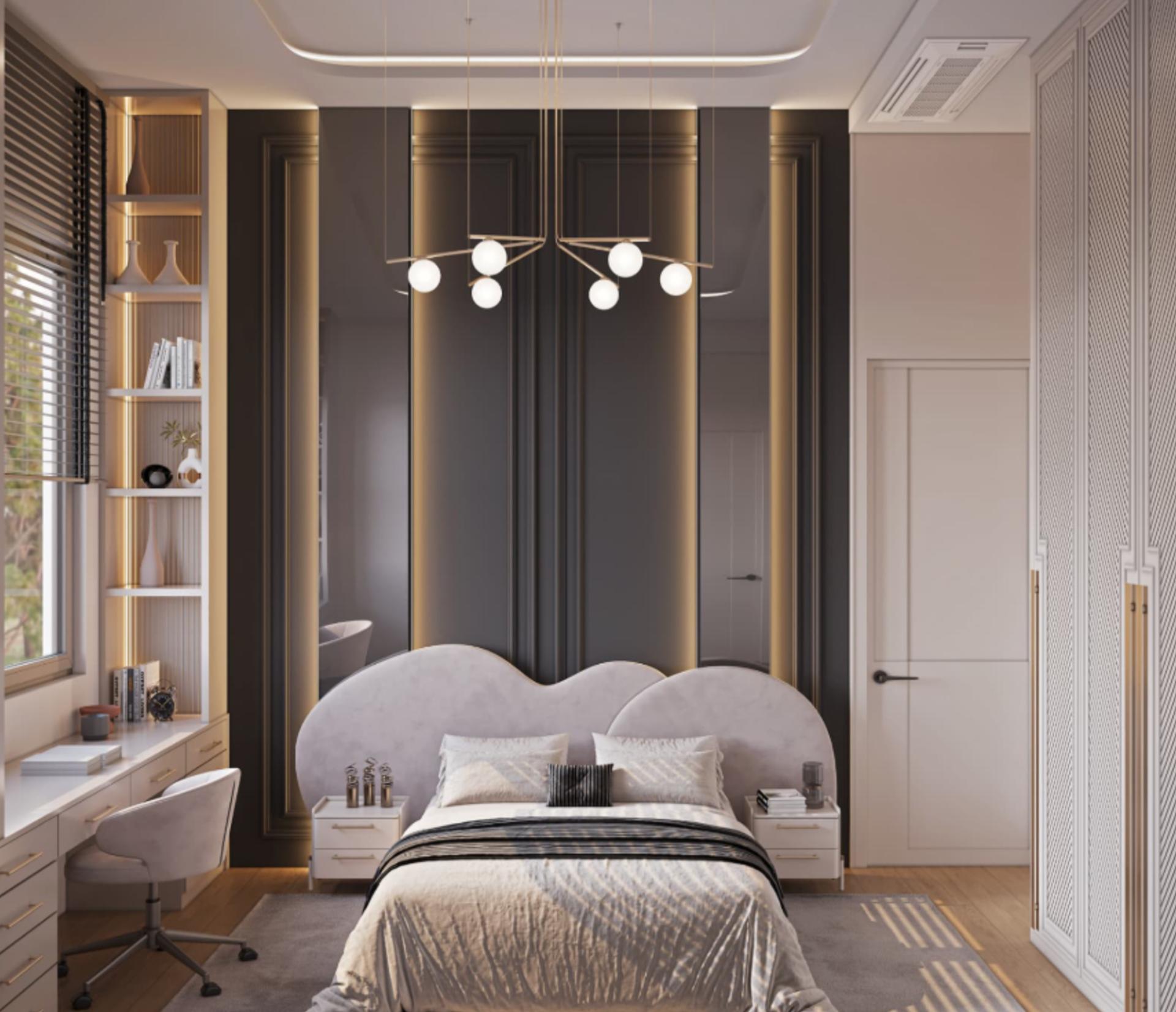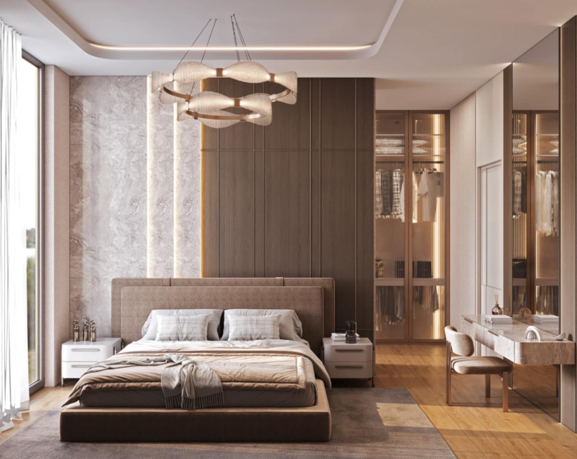Yatak Odaları: Huzurlu bir atmosfer için tasarlanan; kumaş ve ahşabın harmanlandığı geniş yatak başı panelleri, komodinler, dolaplar ve pencere önü oturma alanları.