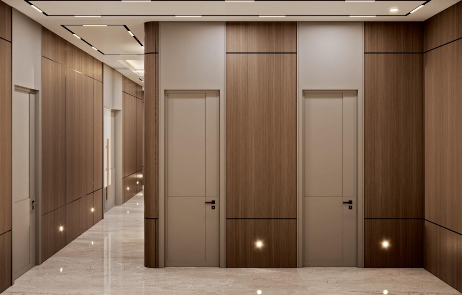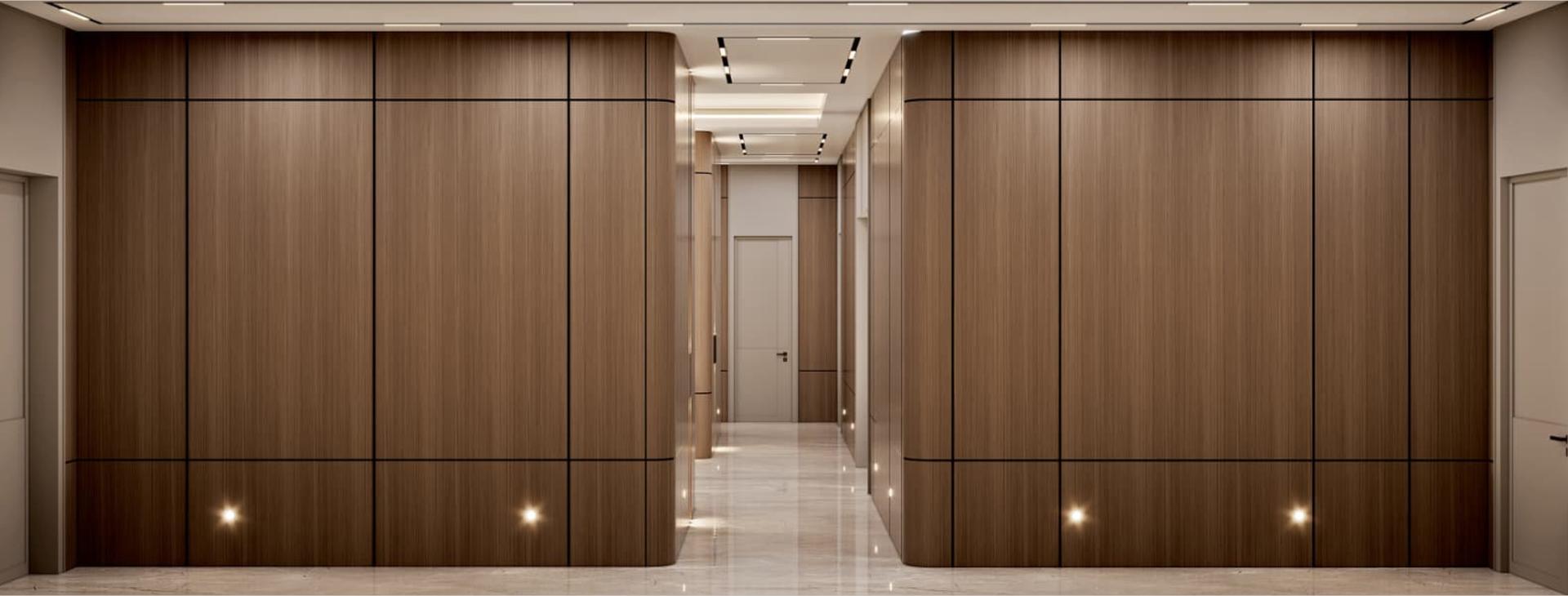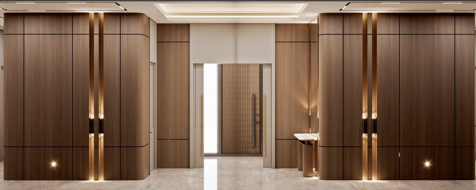 Giriş ve Koridorlar: Villanın görkemli girişini vurgulayan, zeminden tavana kadar devam eden özel tasarım ahşap lambri uygulamaları. Kapı kasaları ve süpürgeliklerle bütünleşik, kesintisiz bir ahşap hat oluşturulmuştur.