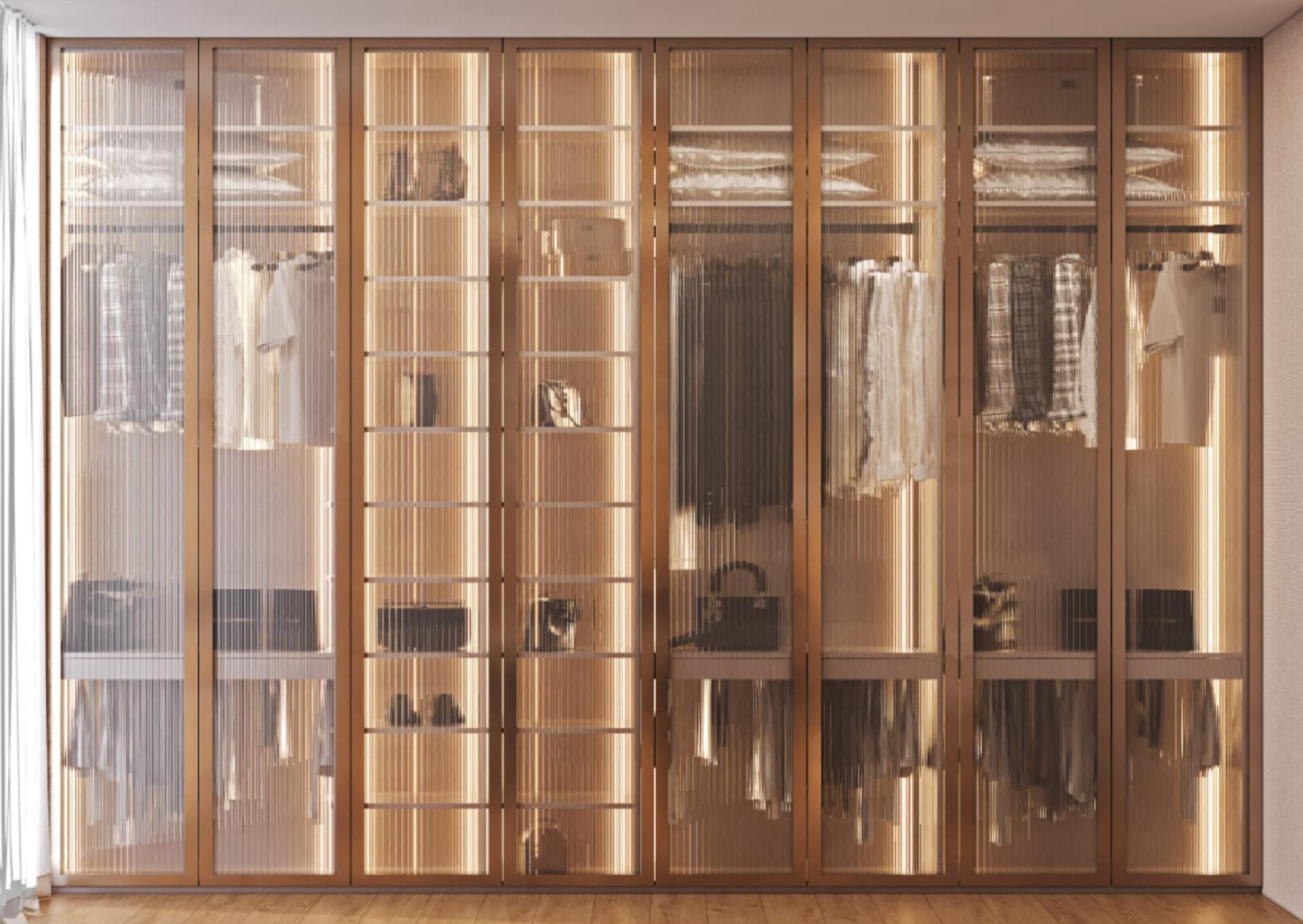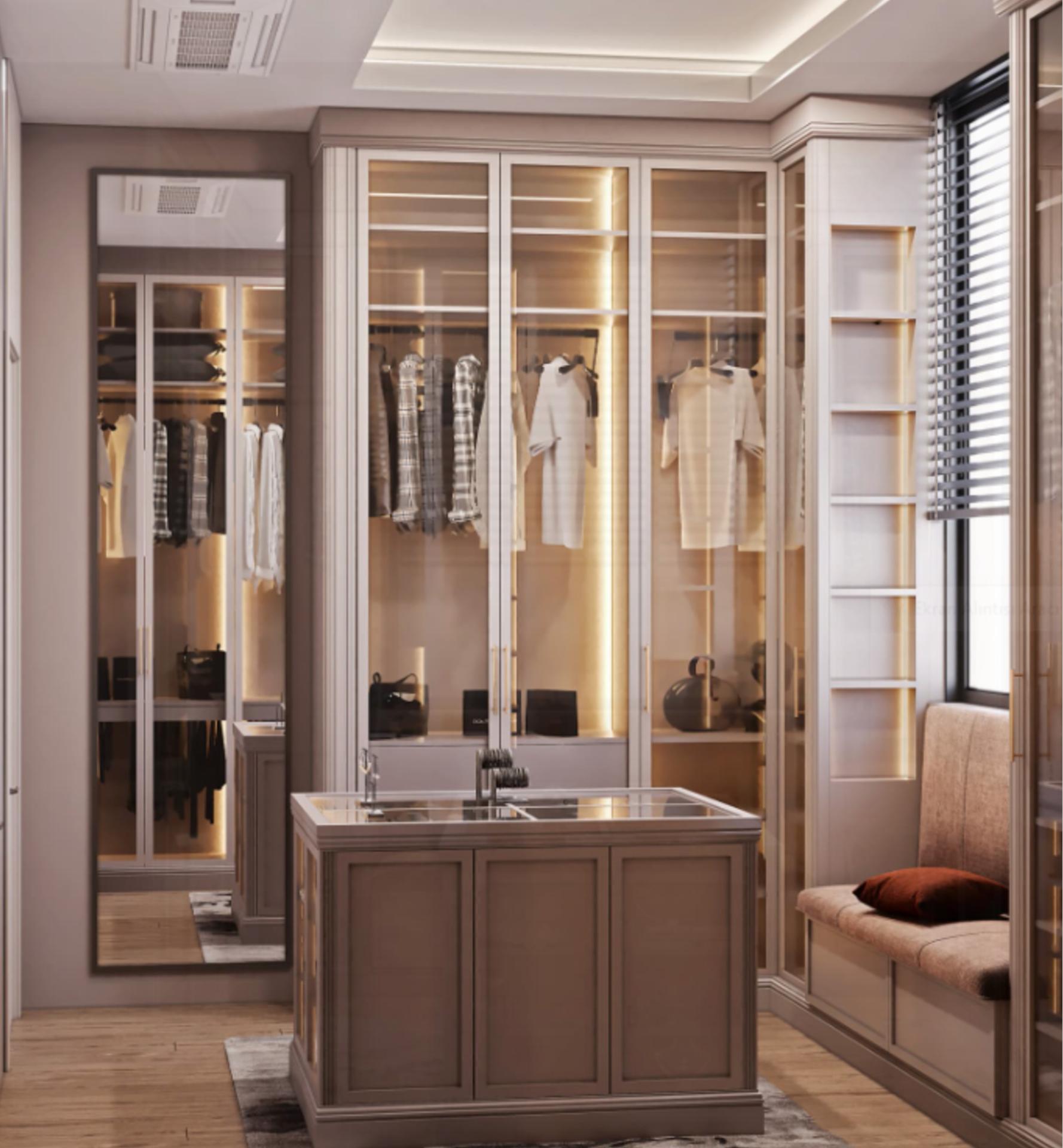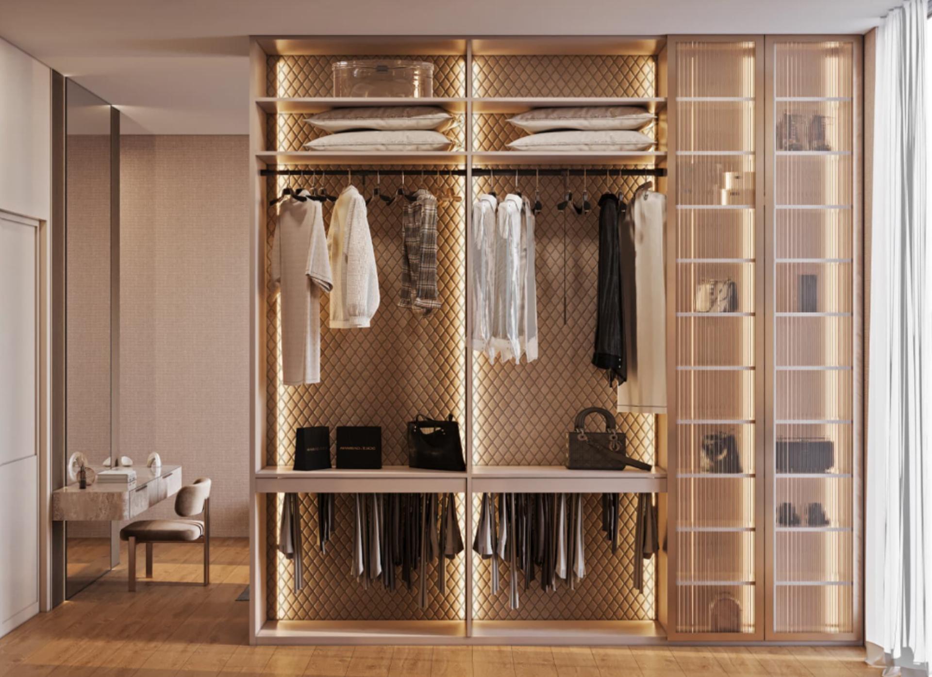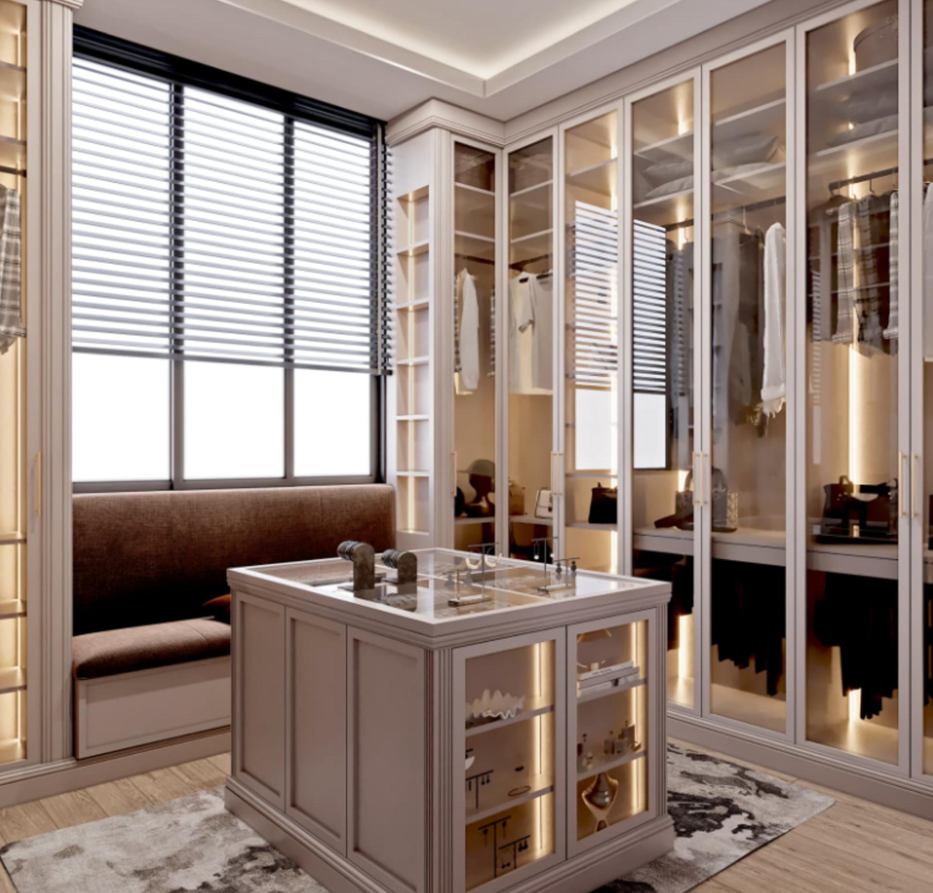 Giyinme Odaları: Geniş hacimli, cam ve ahşap kapak kombinasyonlu, sensörlü aydınlatma sistemine sahip giyinme odası sistemleri.