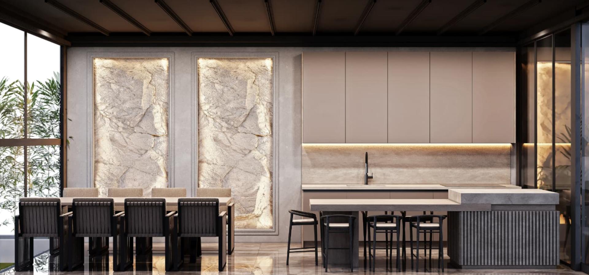 Mutfak: Villa yaşamının ihtiyaçlarına yanıt veren, geniş depolama alanlı ve büyük ada üniteli mutfak tasarımı. Özel mat lake yüzeyler ve fonksiyonel iç mekanizmalarla donatılmış profesyonel bir üretim.