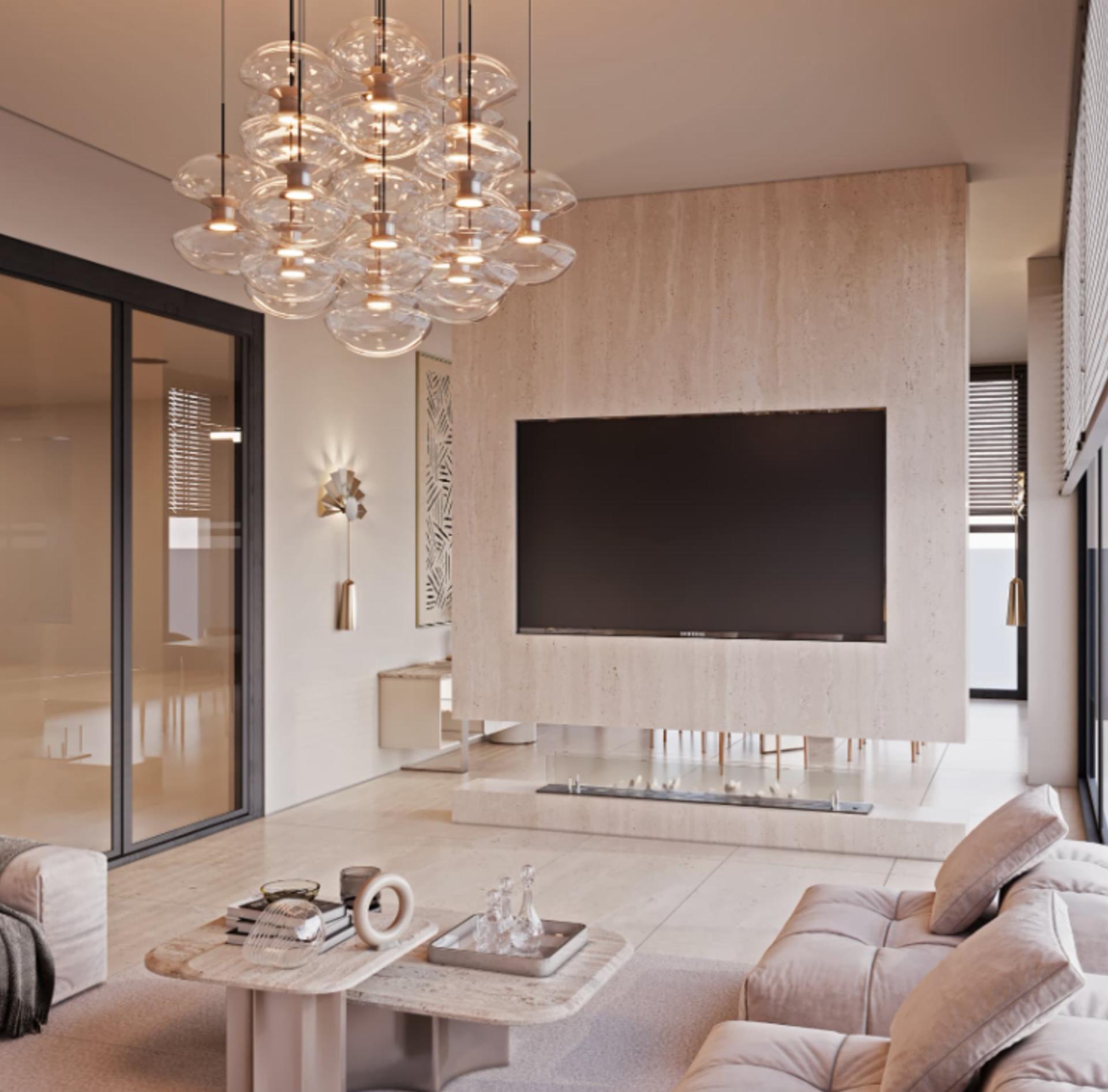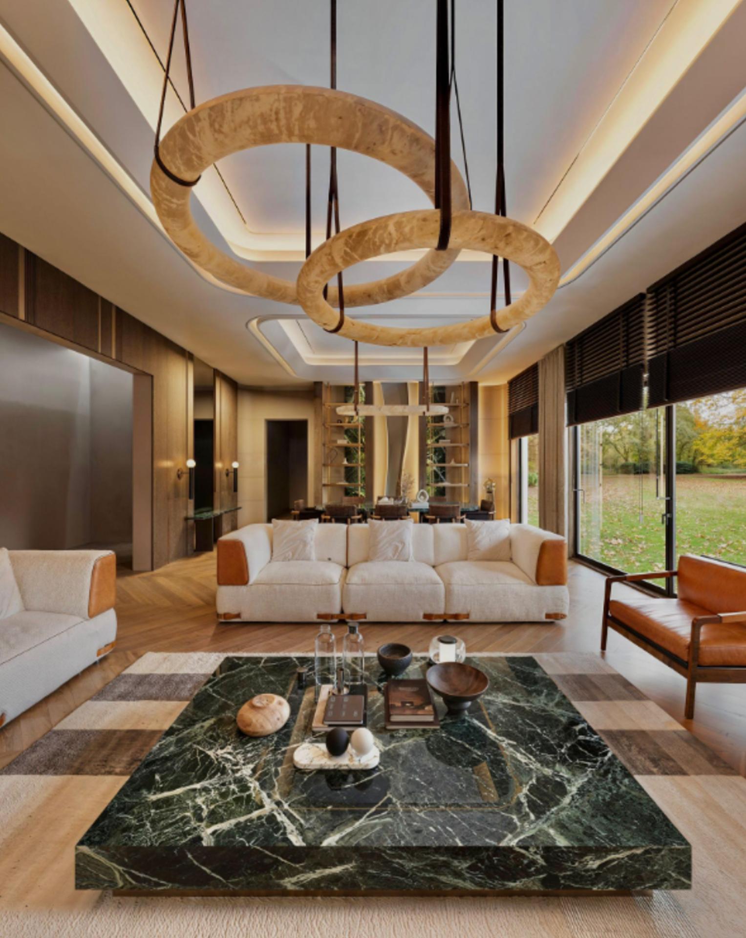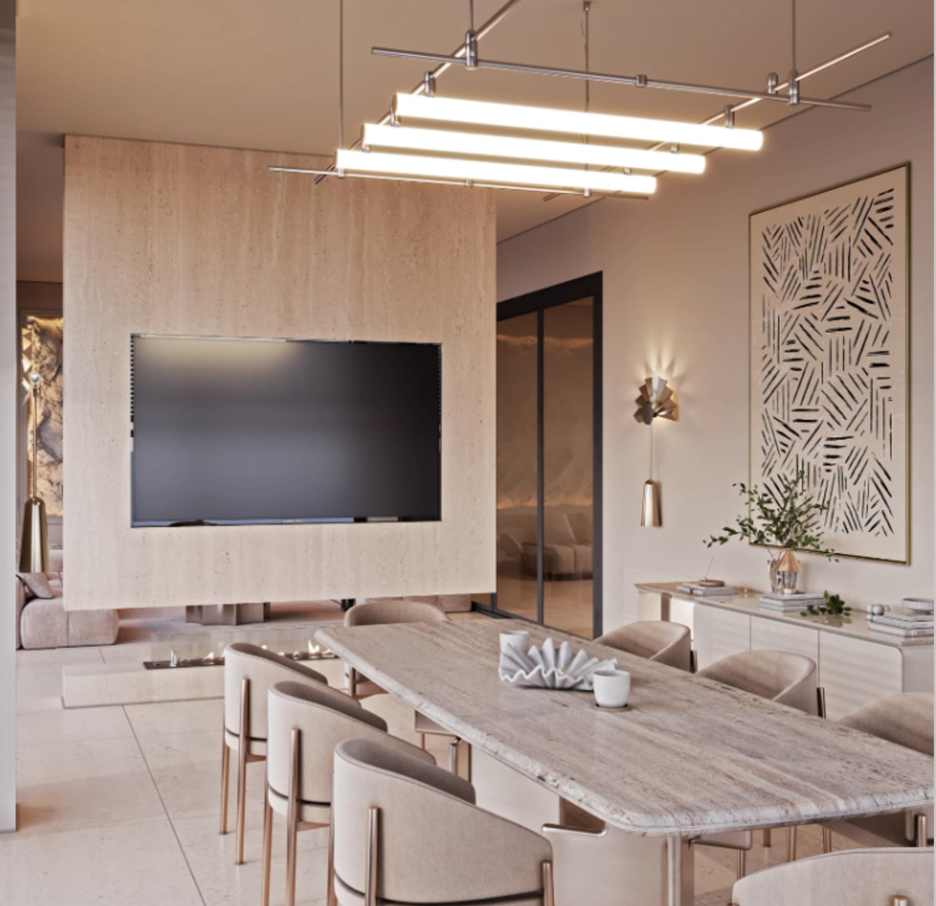 Salon ve Yaşam Alanı: Mekânın genişliğine uygun, duvarı boydan boya kaplayan masif detaylı TV ünitesi, dekoratif nişler ve mekâna sıcaklık katan tavan-duvar ahşap geçişleri.
