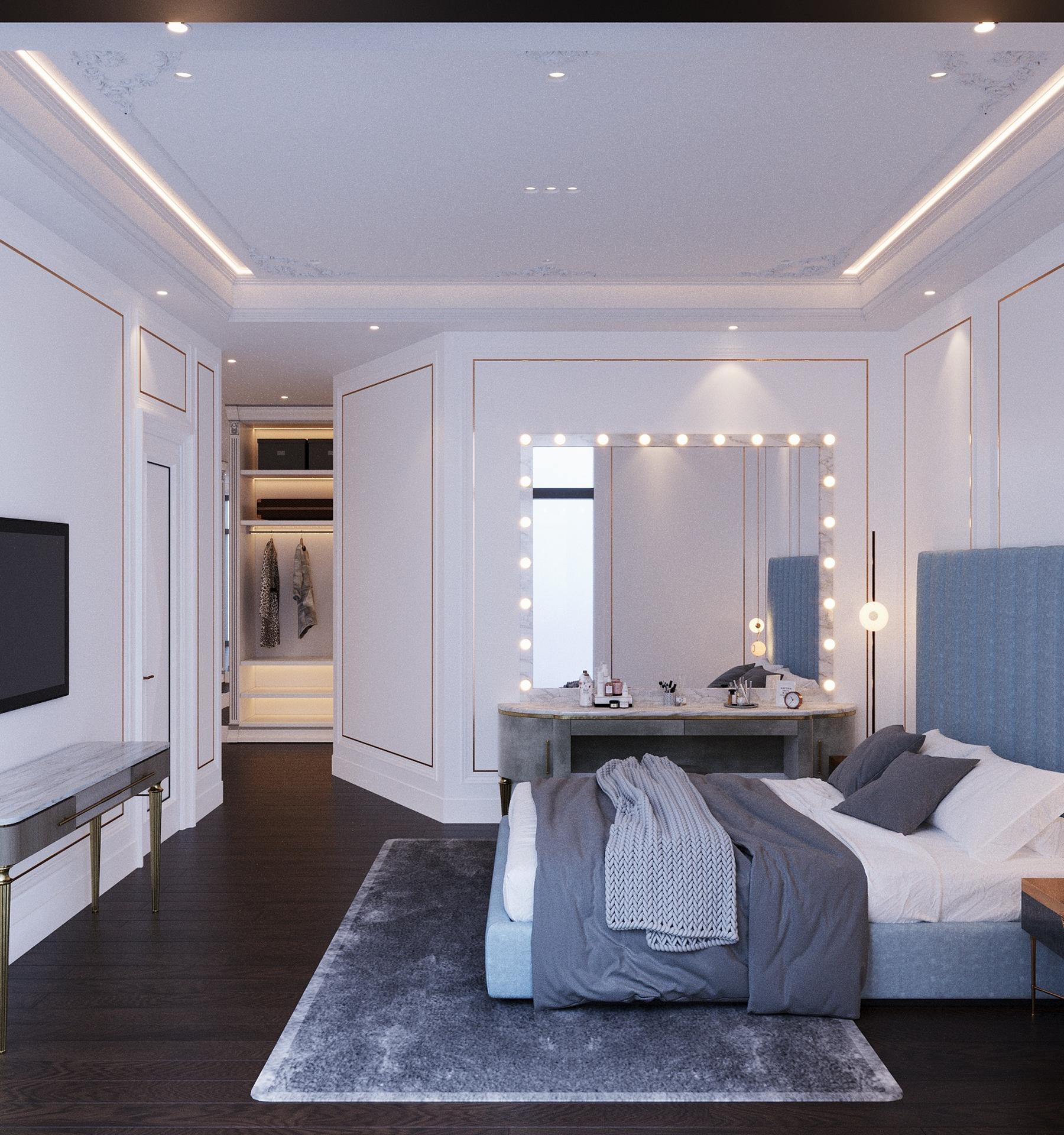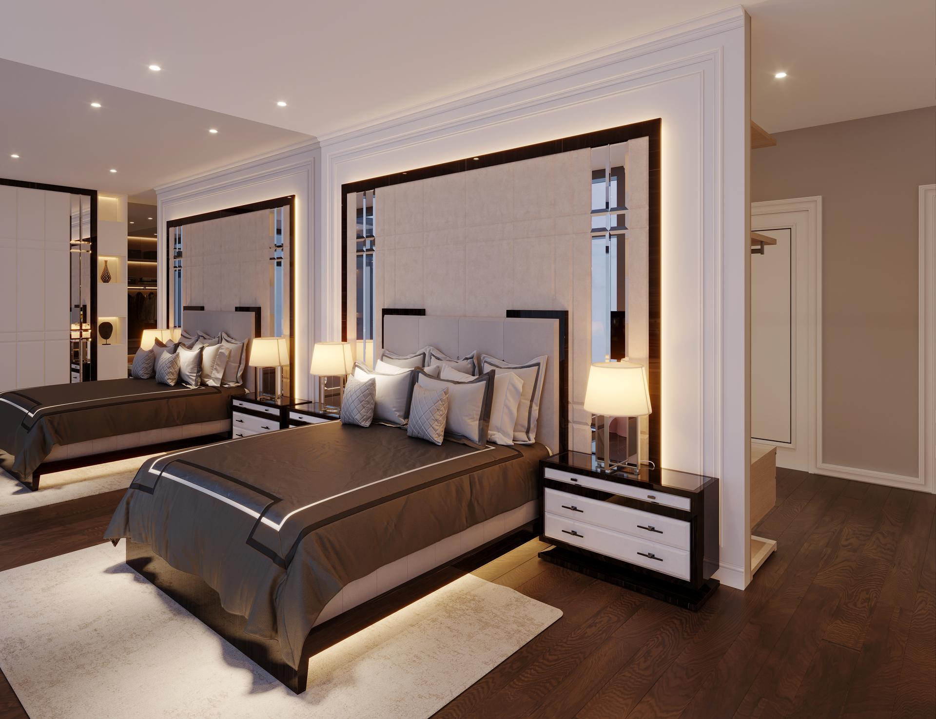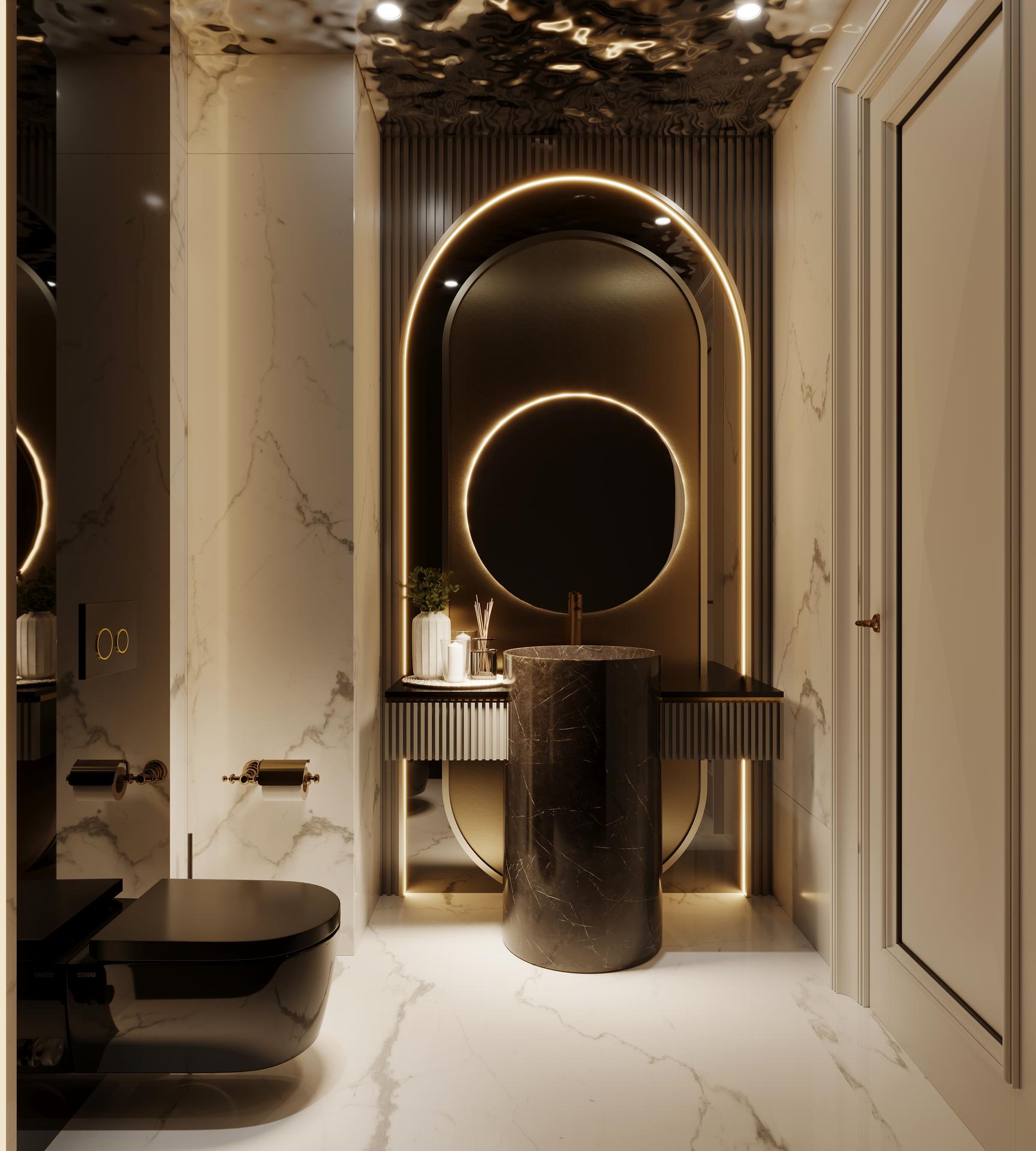 Salon ve Yaşam Alanı: Mekânın odak noktası olan TV ünitesinde; doğal mermer, ahşap ve pirinç (metal) detayların kusursuz birleşimi. Duvarlarda mekân derinliğini artıran lambri ve ayna uygulamaları.