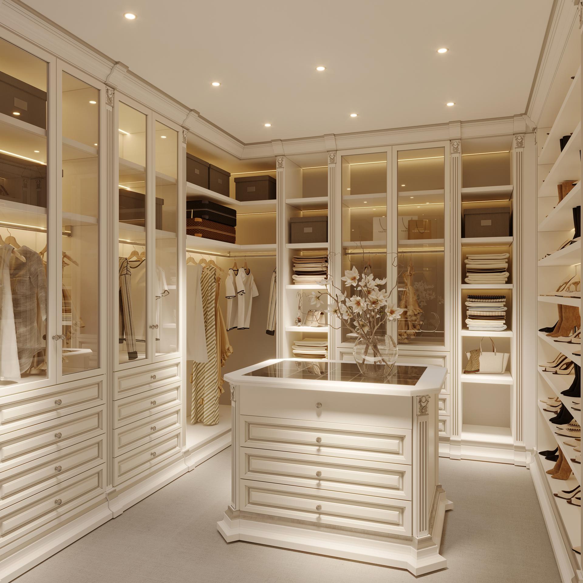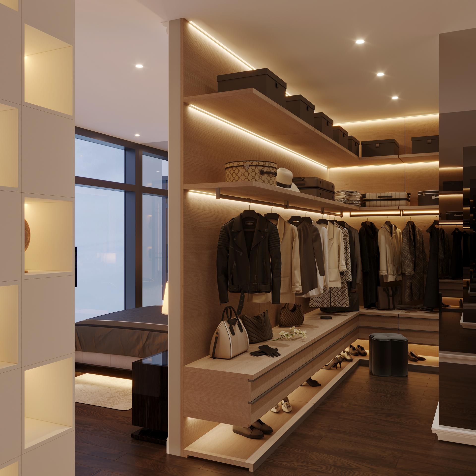 Giyinme Odaları: Kişisel bir butik lüksünde tasarlanan; bronz alüminyum çerçeveli ve füme cam kapaklı gardırop sistemleri. Entegre LED aydınlatmalar ve özel aksesuar çekmeceleriyle şık bir sergileme alanı.