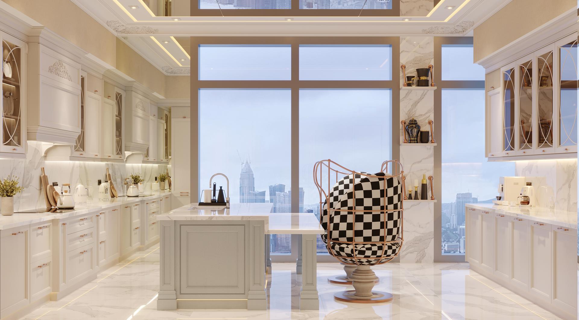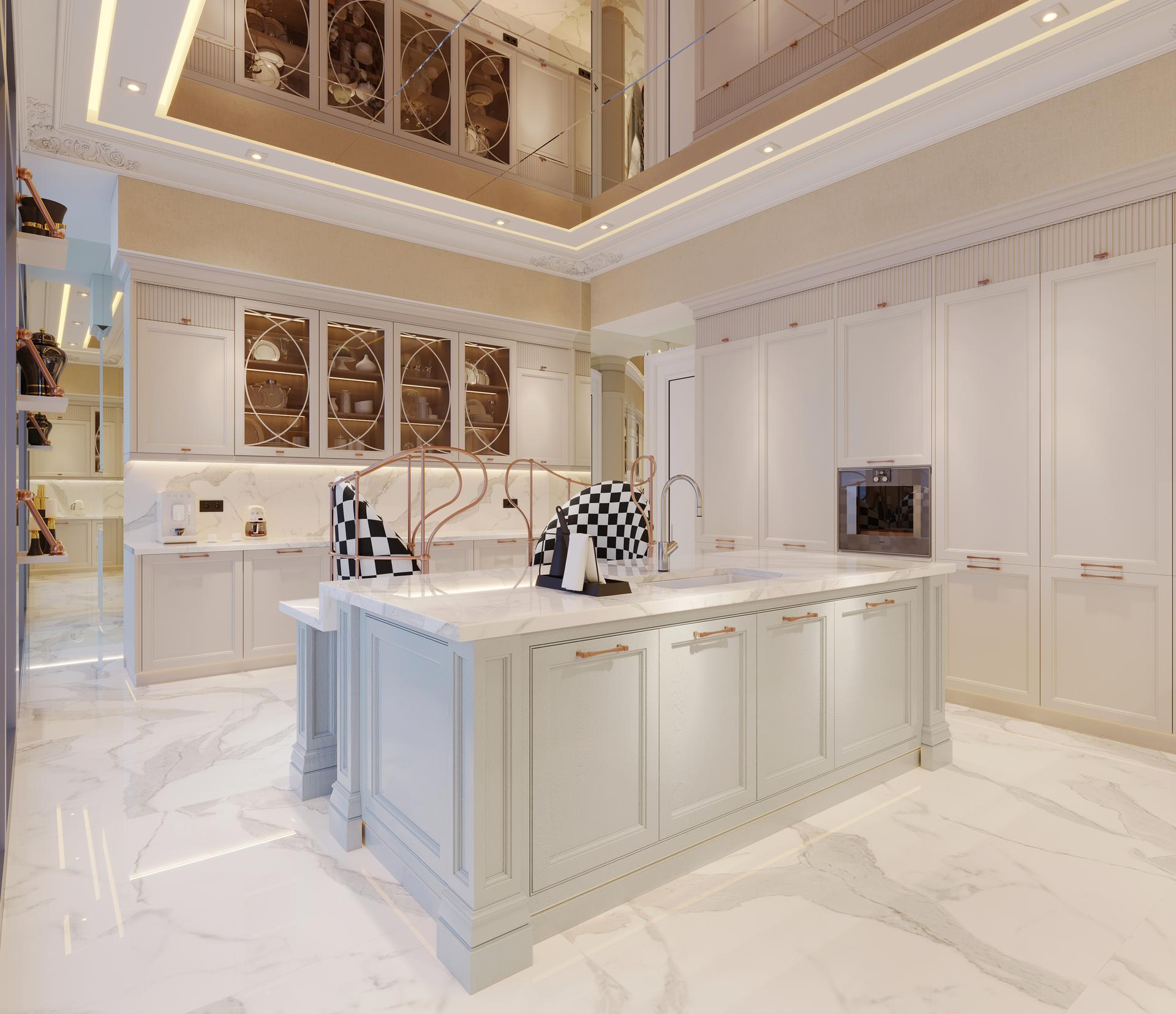 Mutfak: Fonksiyonelliğin estetikle buluştuğu; özel lake boyalı kulpsuz kapaklar, porselen tezgahla bütünleşen ada ünitesi ve teknolojik aksesuarlarla donatılmış iç tasarım.