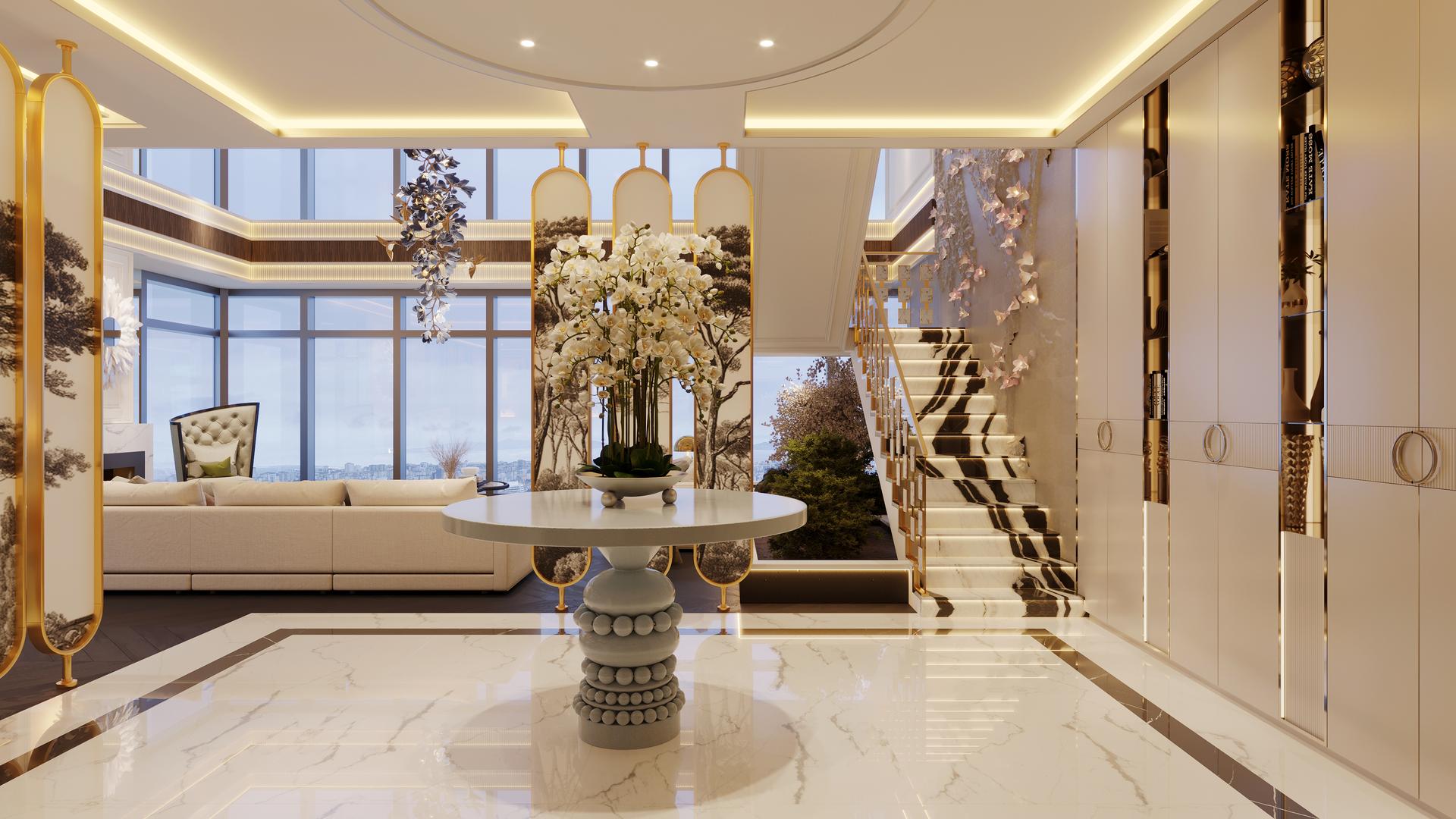 Giriş ve Karşılama: Daireye ilk adımda prestiji hissettiren; duvarla bütünleşik gizli vestiyer sistemleri, ayna detaylı dresuar alanları ve koridor boyunca devam eden dekoratif ahşap duvar panelleri.