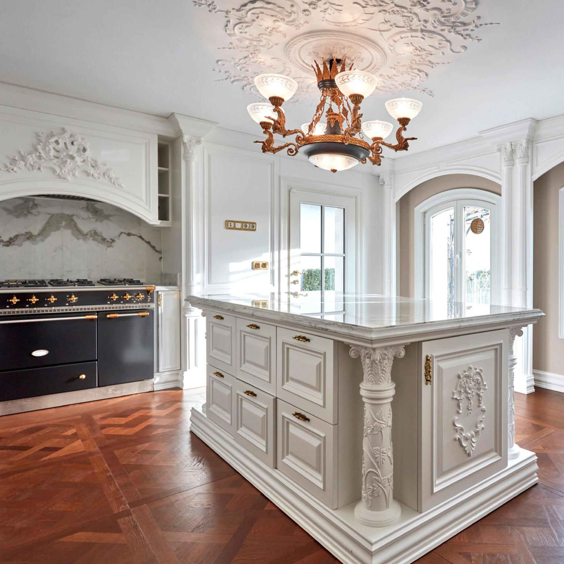 Özel Tasarım Mutfak ve Islak Hacimler: Klasik yalı estetiğiyle bütünleşen; masif ahşap ve el boyaması lake yüzeylerin kullanıldığı, modern donanımlarla entegre mutfak ve banyo dolap üniteleri.