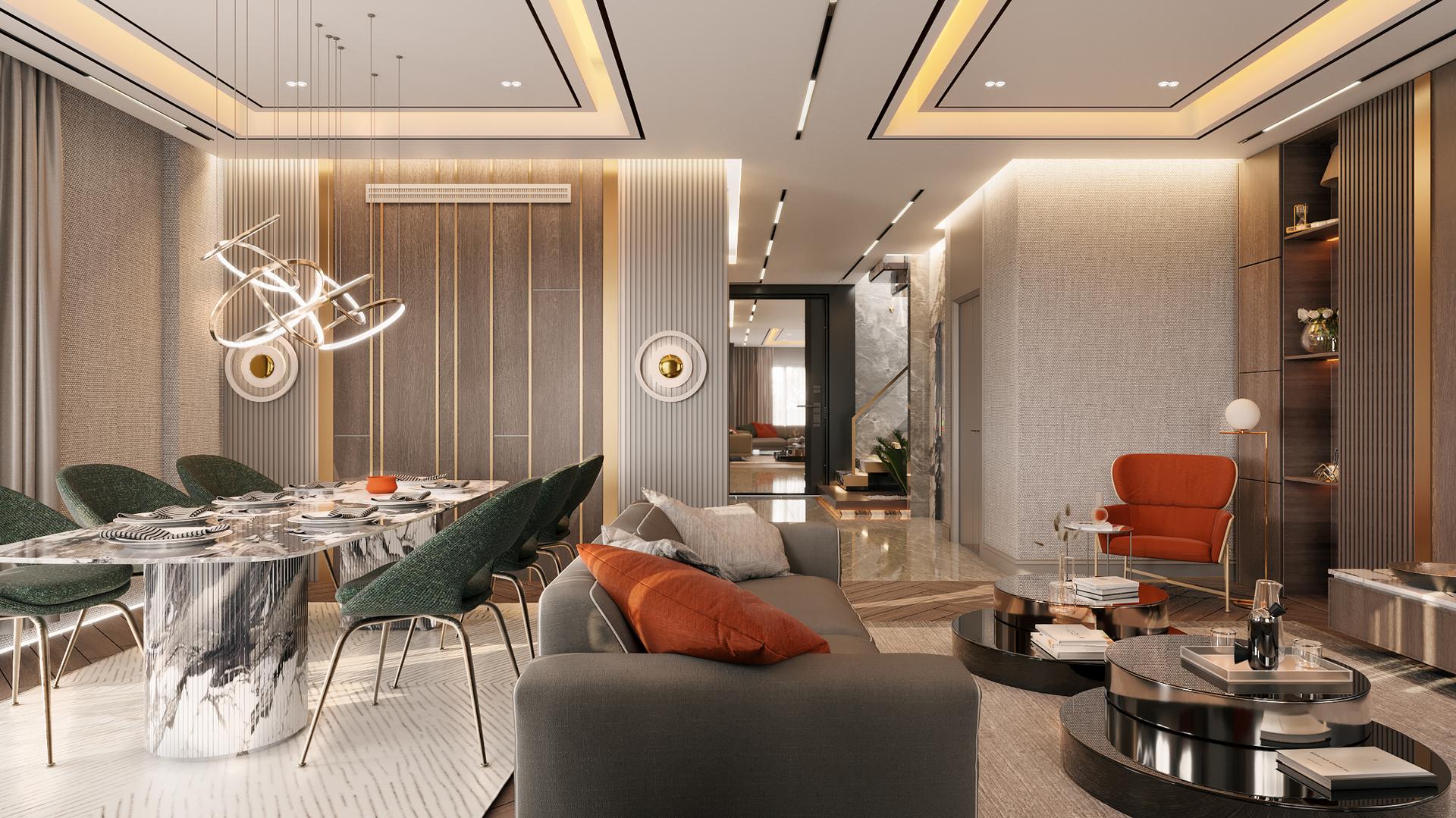 Genel Mekân Giydirmeleri: Villanın karakterini belirleyen duvar panellerinde, son dönemin trendi olan yivli ahşap dokular ve kumaş kaplamalar, milimetrik hassasiyetle uygulanmıştır. Mekâna derinlik katan bu detaylar, gizli LED aydınlatma kanalları ile desteklenmiştir.