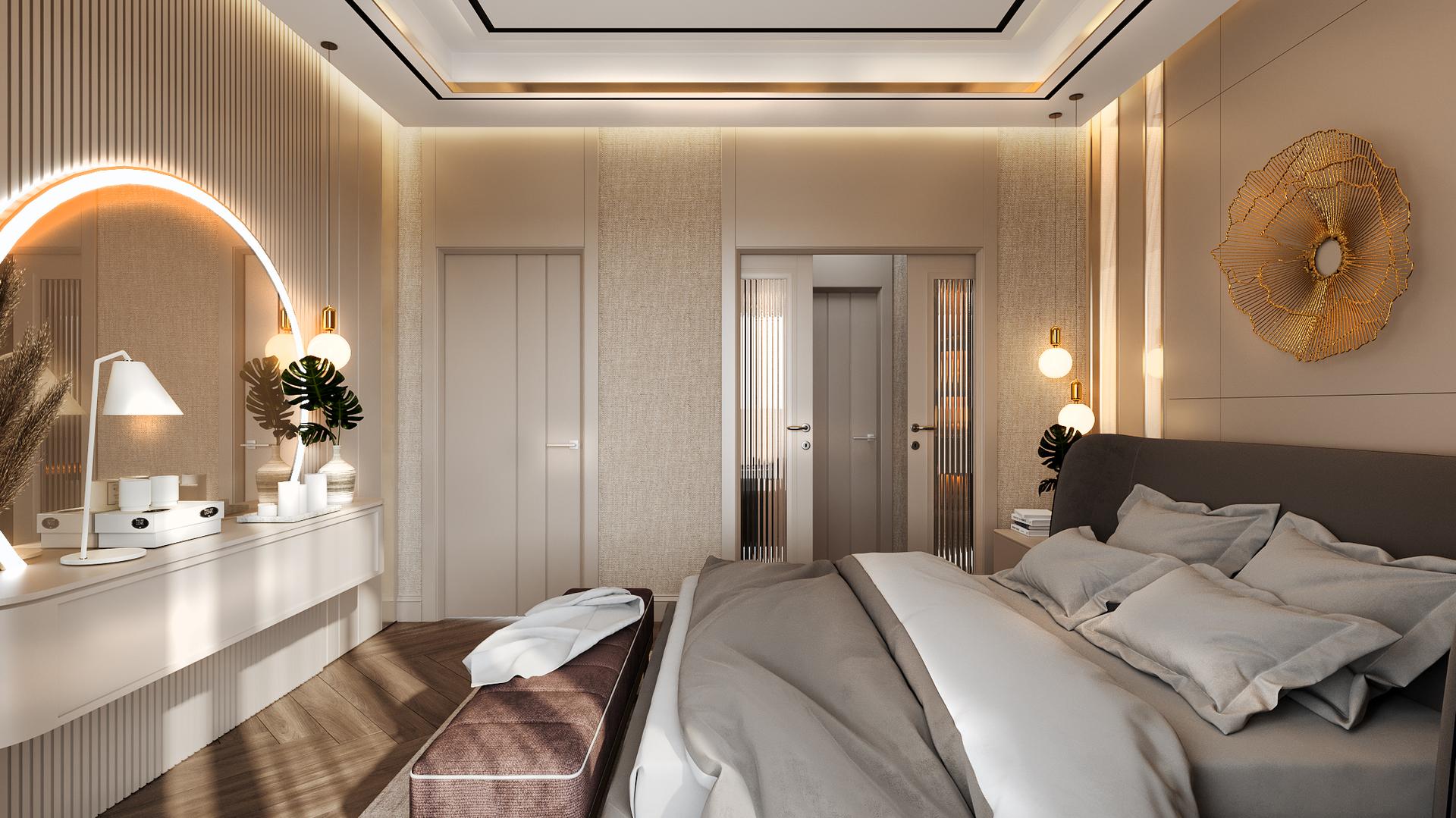 Özel Üretim Mobilyalar: Yatak odalarında görülen kavisli (formlu) makyaj üniteleri, sürgü kapaklı giyinme dolapları ve yatak başı lambri sistemleri, mekâna özel olarak üretilmiştir.