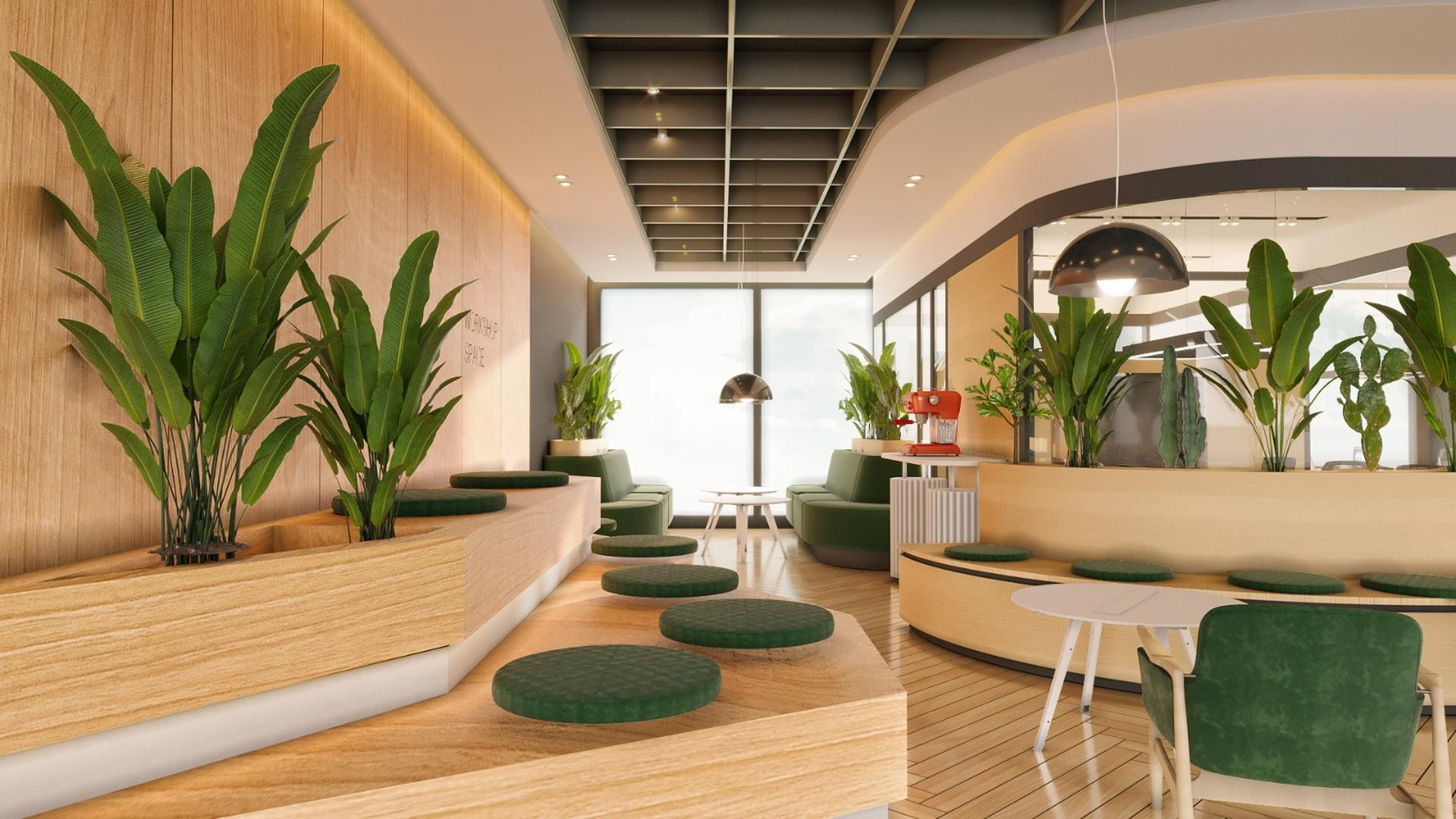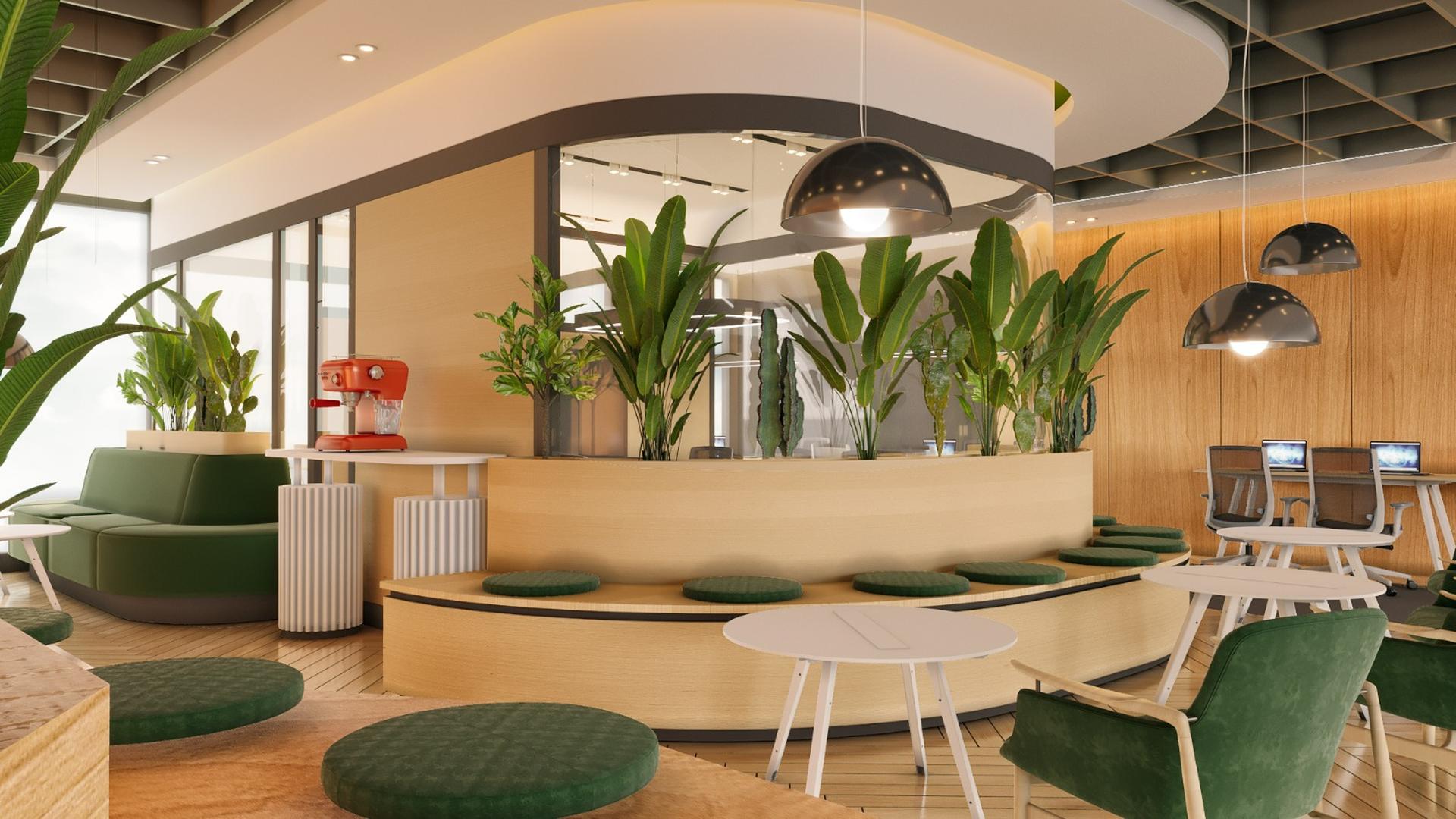 Kavisli Ahşap Üniteler: Mekânın merkezinde yer alan ve sirkülasyonu yönlendiren kavisli formdaki oturma bankları ve entegre saksı üniteleri. Ahşabın büküm teknikleri kullanılarak işlenmesiyle, keskin köşelerden arındırılmış yumuşak geçişler sağlanmıştır.