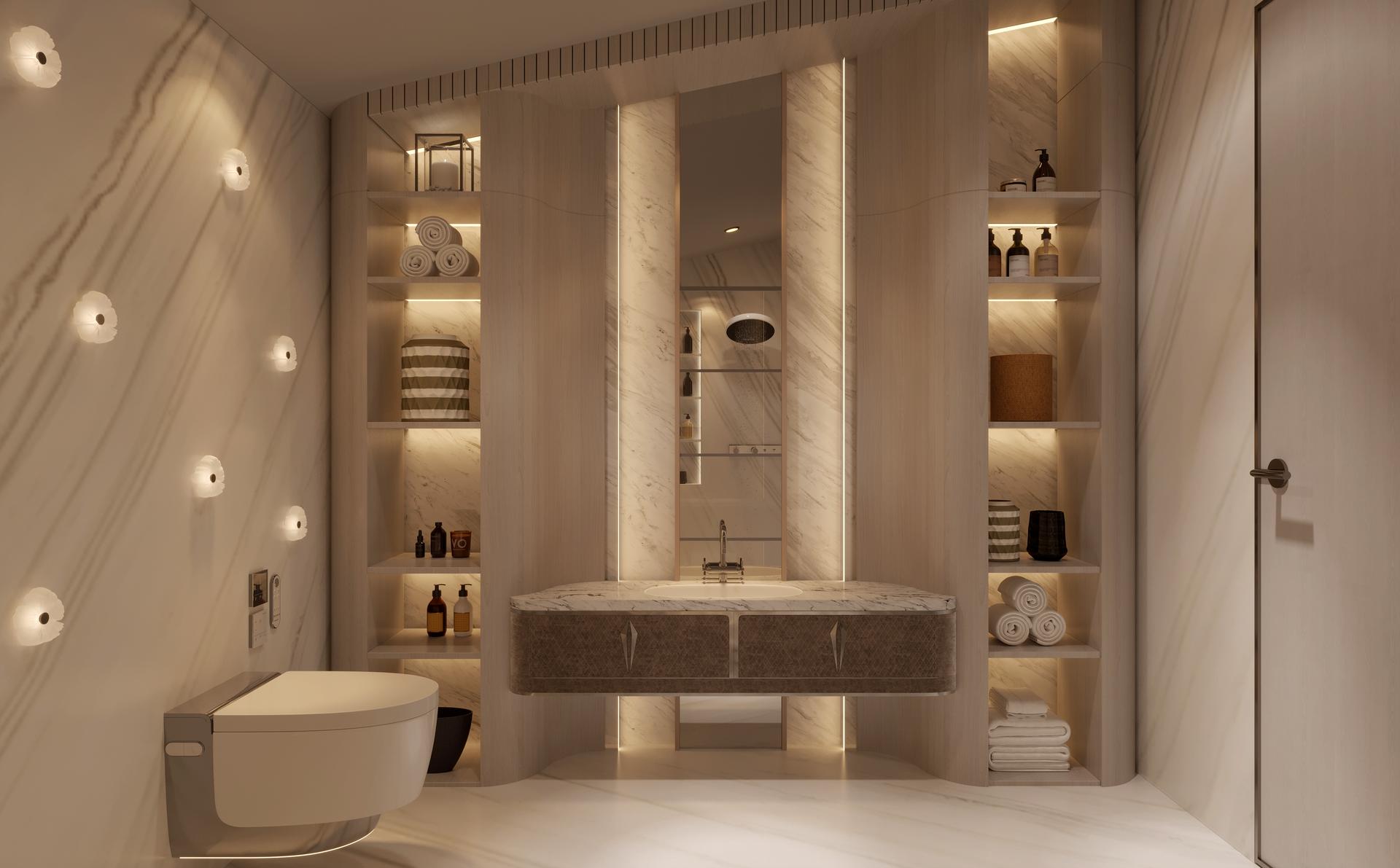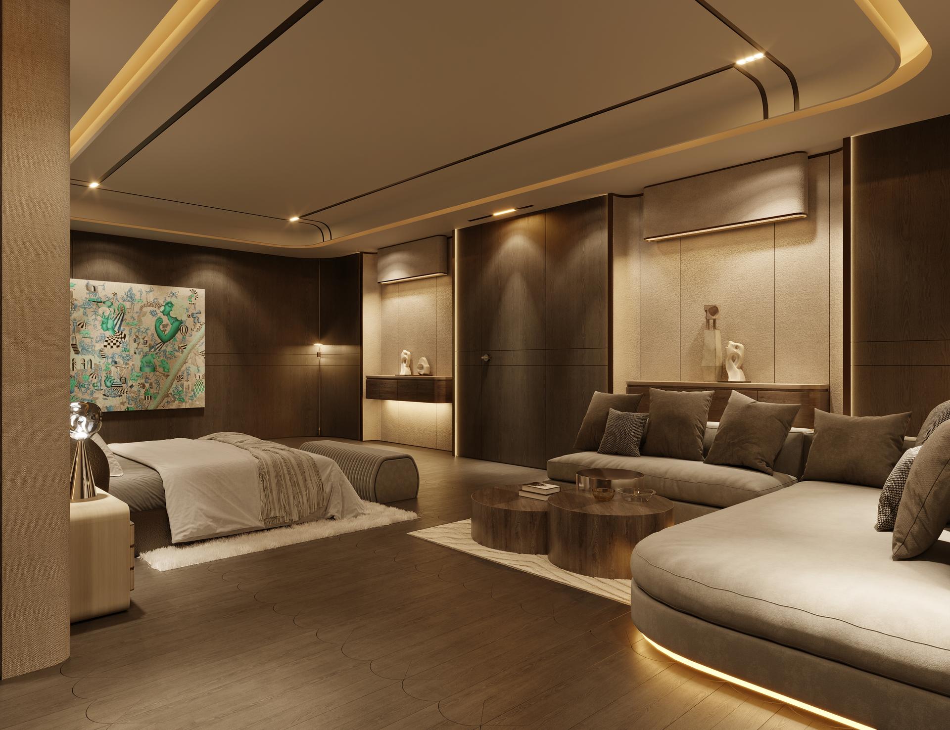 Yatak Odası ve Banyolar: Huzurun ve dinginliğin ön planda olduğu yatak odalarında kullanılan yumuşak dokulu ahşaplar ve banyolardaki neme dayanıklı özel üretim dolaplar, konforu lüks bir standarda taşıyor.