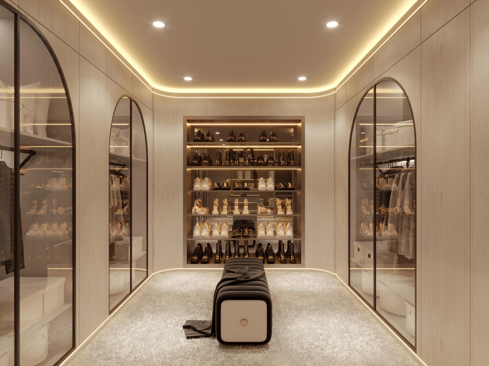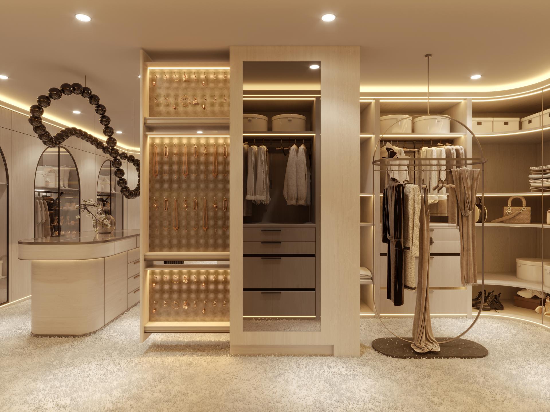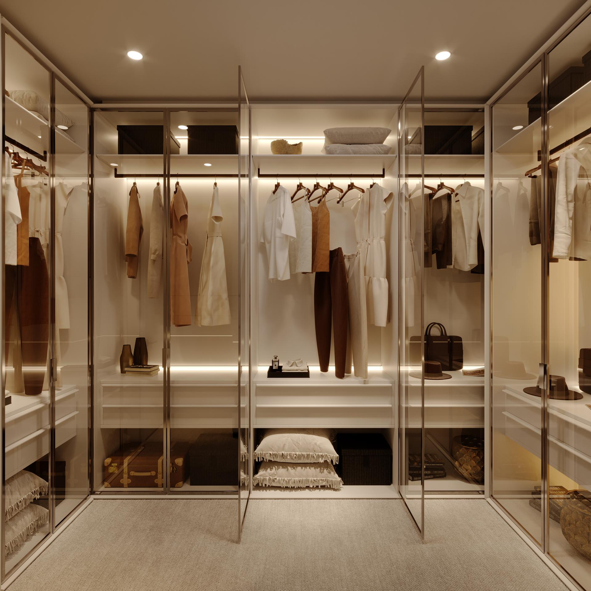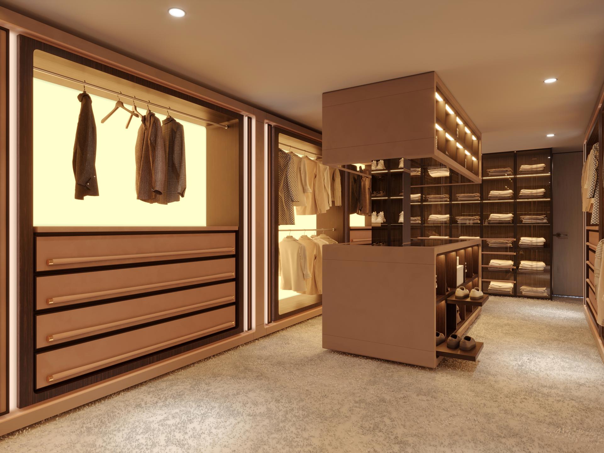Giyinme Odaları: Kişisel bir butik şıklığında tasarlanan giyinme alanlarında; bronz profil detaylı reflekte cam kapaklar ve özel aydınlatma senaryoları ile kıyafetlerin sergilendiği, seçkin bir atmosfer yaratıldı.