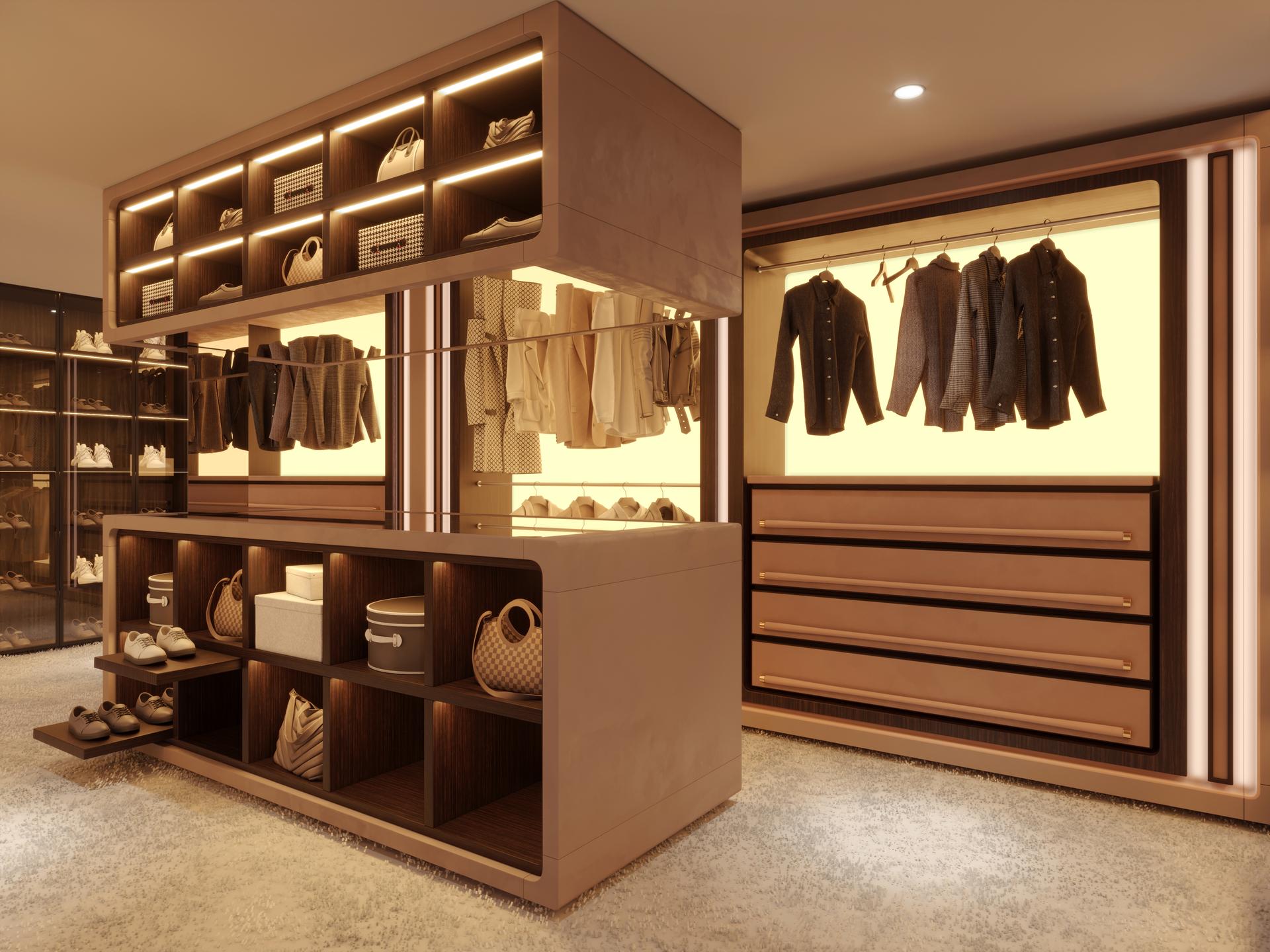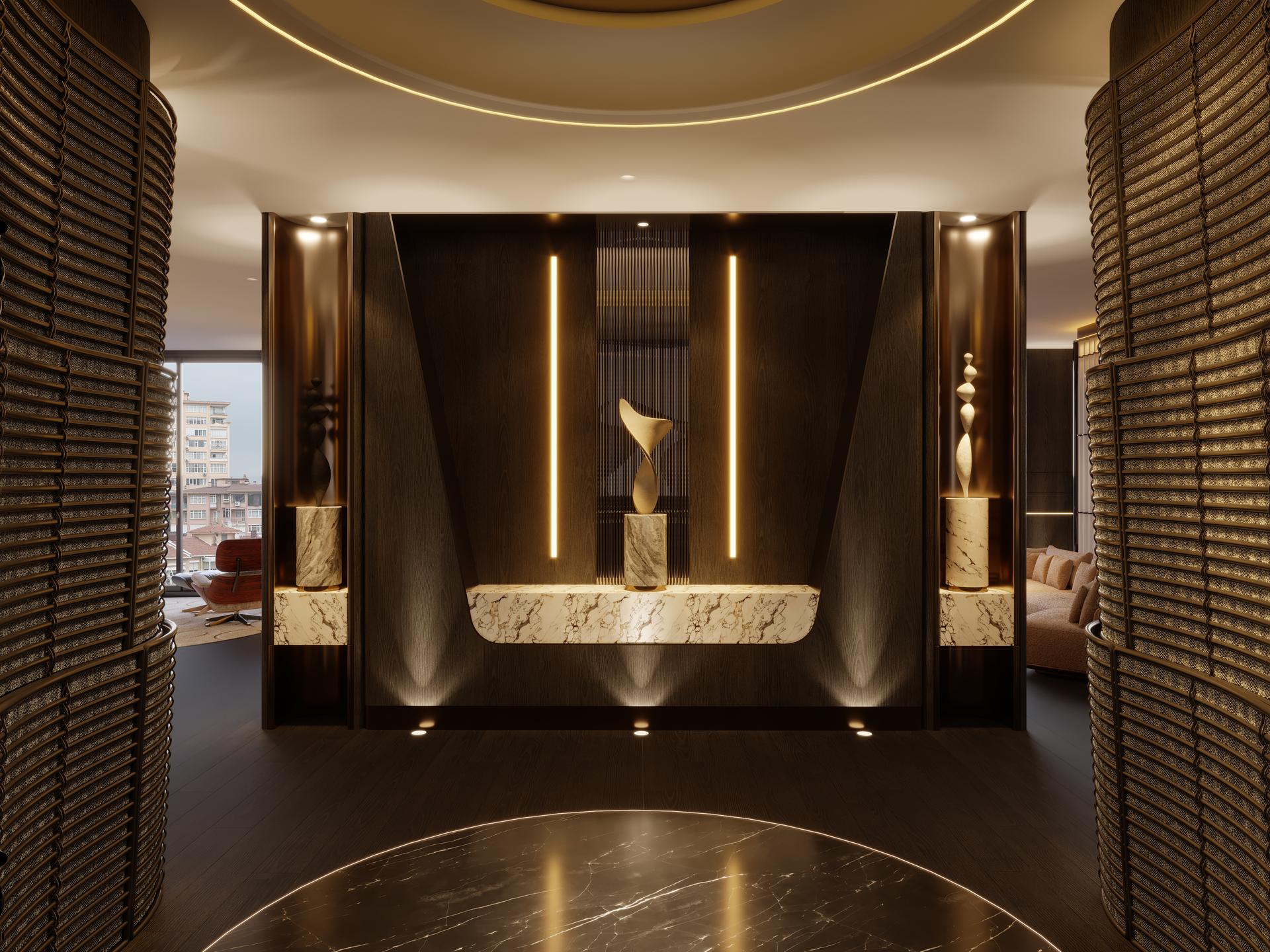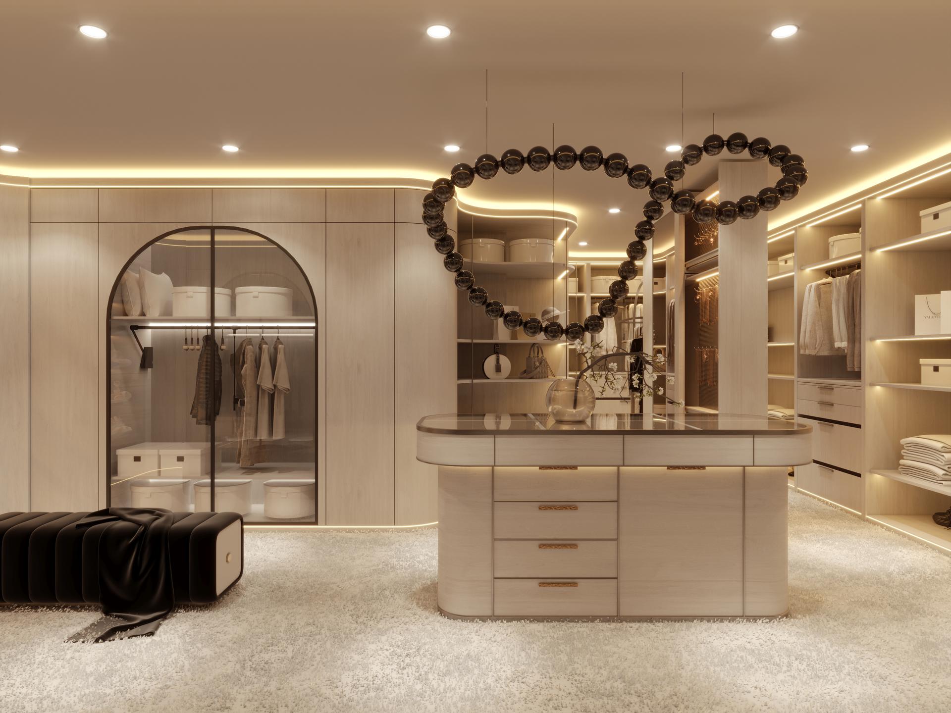 Giyinme Odaları: Kişisel bir butik şıklığında tasarlanan giyinme alanlarında; bronz profil detaylı reflekte cam kapaklar ve özel aydınlatma senaryoları ile kıyafetlerin sergilendiği, seçkin bir atmosfer yaratıldı.