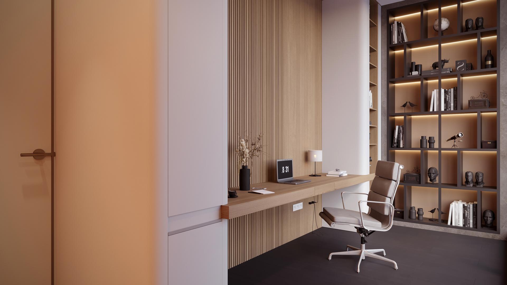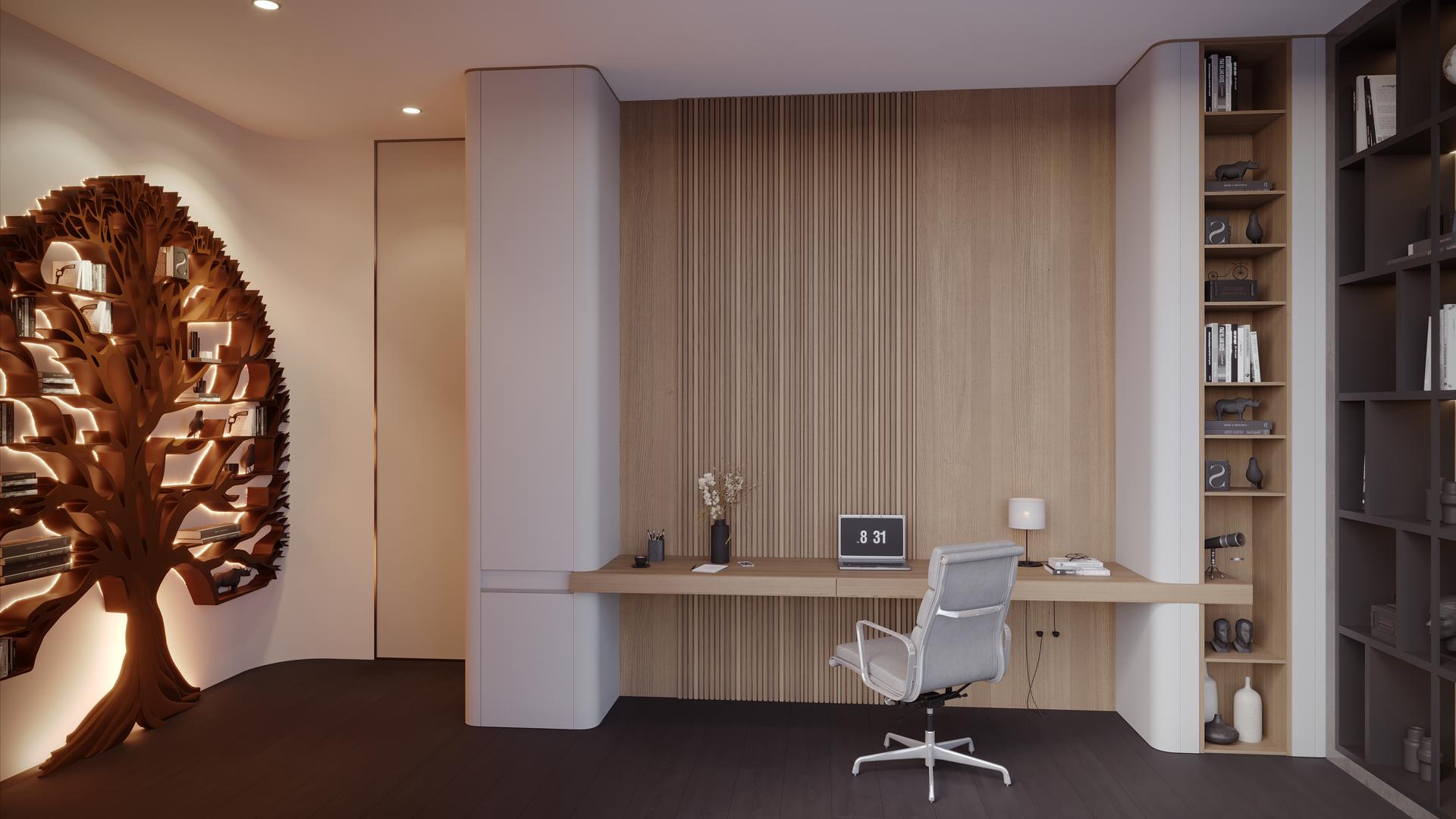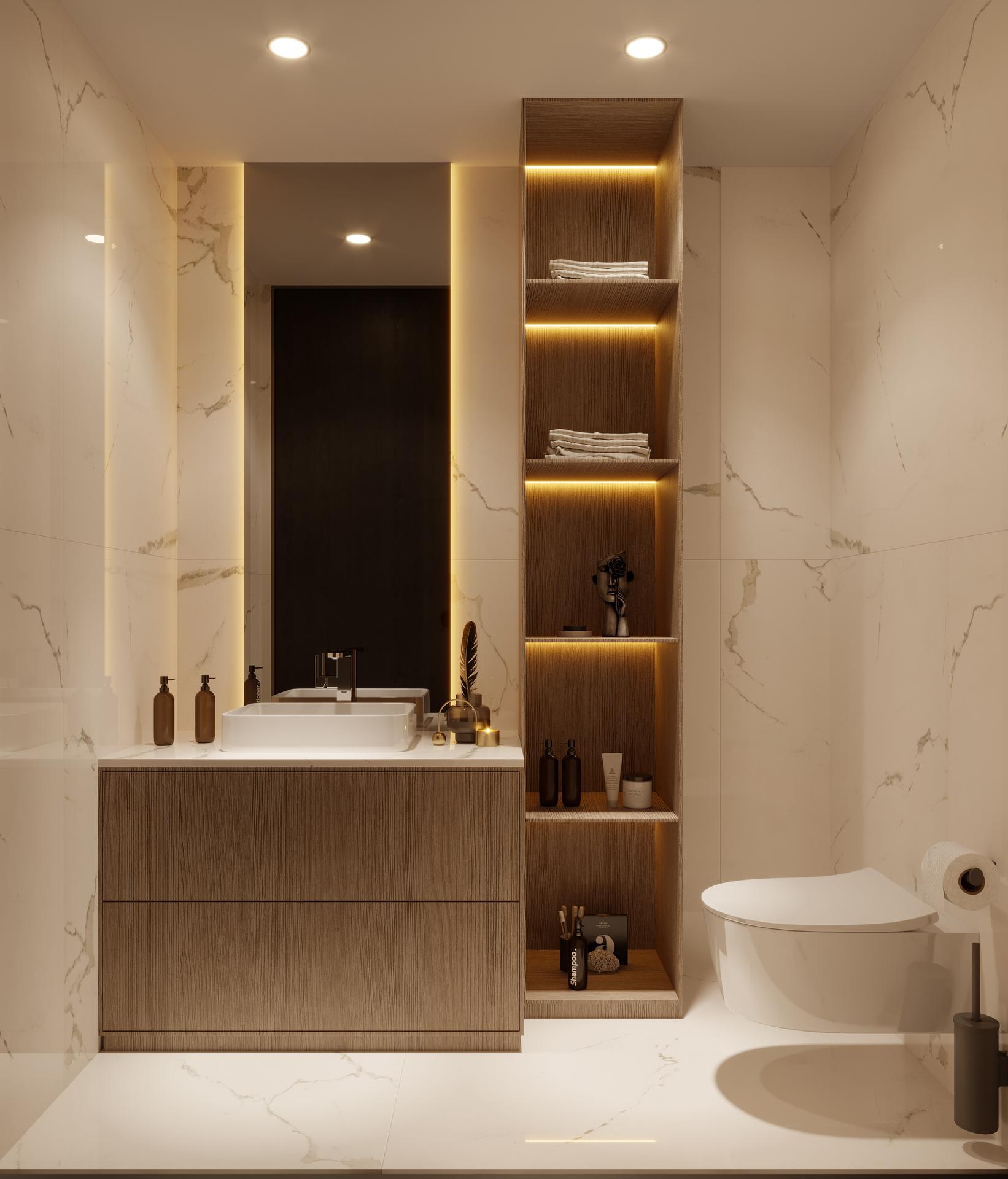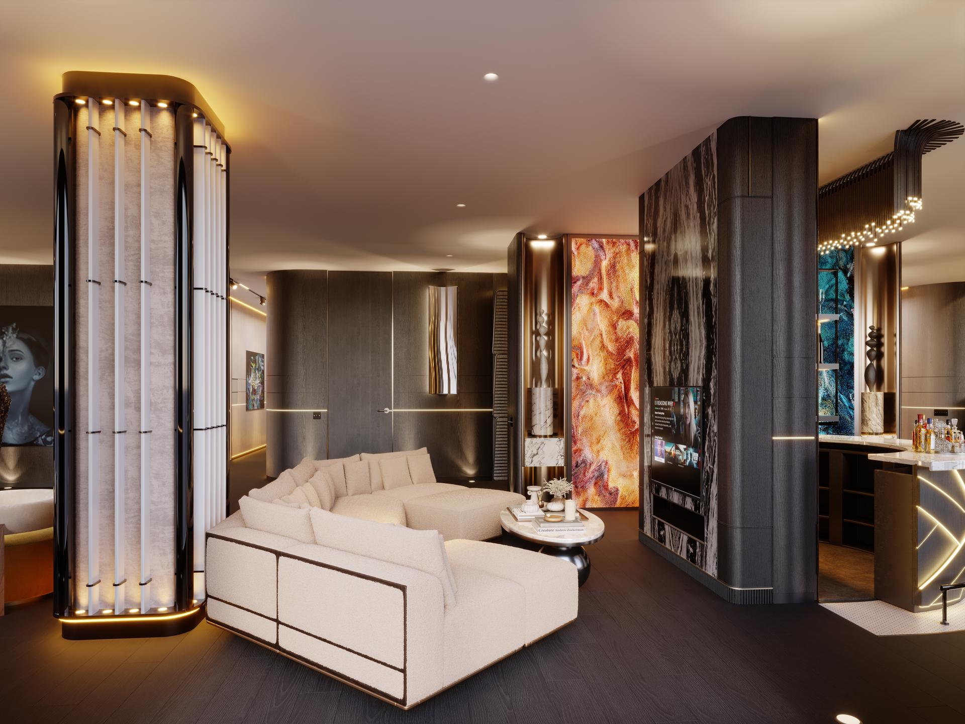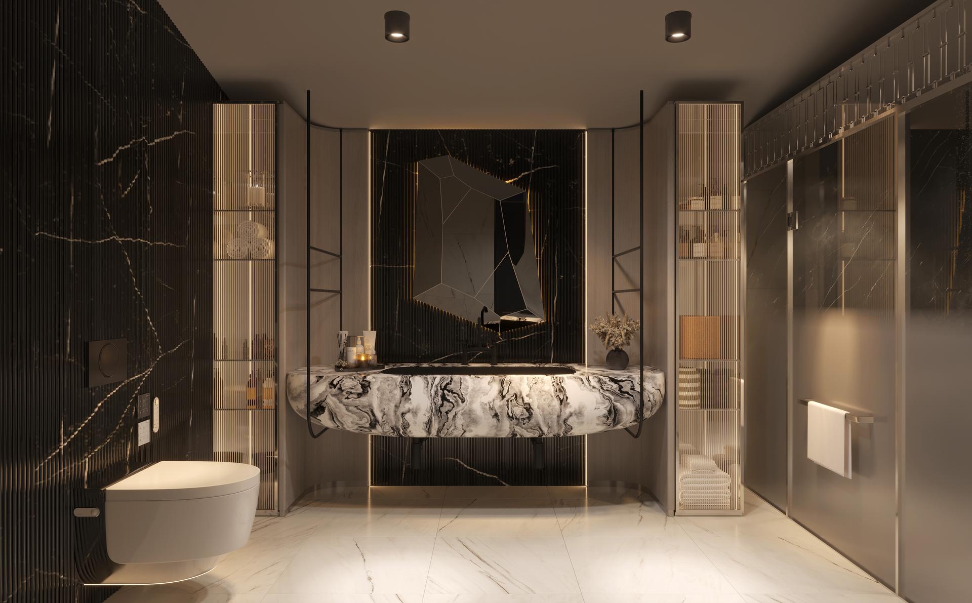 Salon ve Yaşam Alanı: Doğal dokuların modern çizgilerle yorumlandığı salon bölümünde; ahşap, metal ve mermerin zarif birlikteliğini sergileyen TV üniteleri ve dekoratif duvar giydirmeleri, mekânın odak noktasını oluşturuyor.