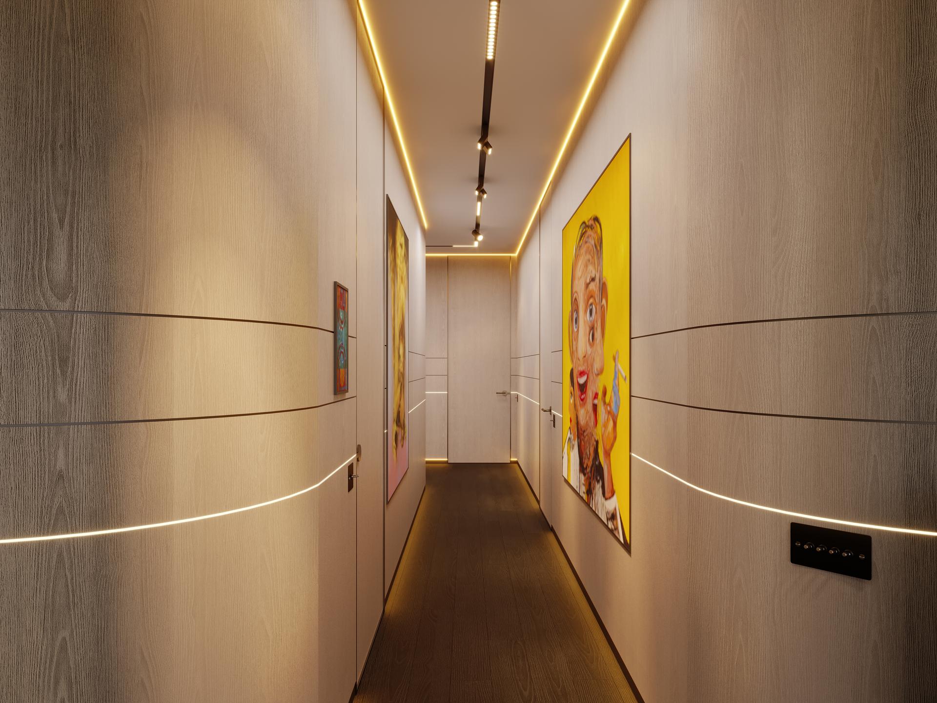 Giriş ve Koridorlar: Mekânın akışkan mimarisiyle dans eden, keskin köşelerden arındırılmış kavisli ahşap duvar panelleri ve tavan geçişleri, eve ilk adım atıldığı andan itibaren büyüleyici bir karşılama sunuyor.