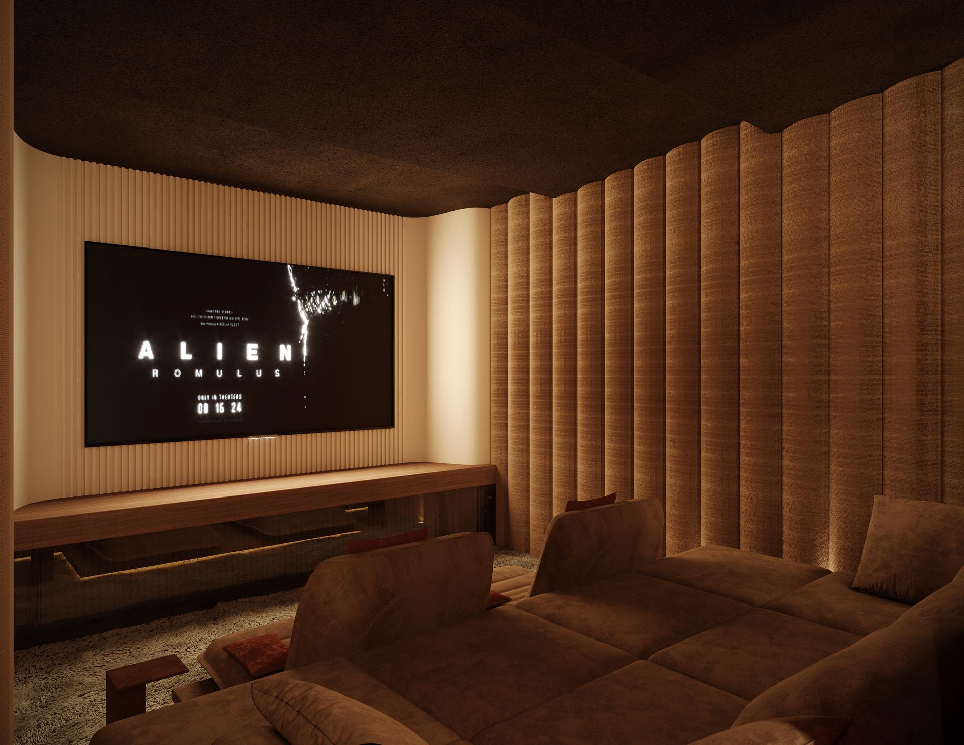 Sinema Odası: Seyir keyfini en üst düzeye çıkaran akustik kumaş ve ahşap panellerin ritmik uyumu ile hem göze hem kulağa hitap eden, dış dünyadan izole bir deneyim alanı.