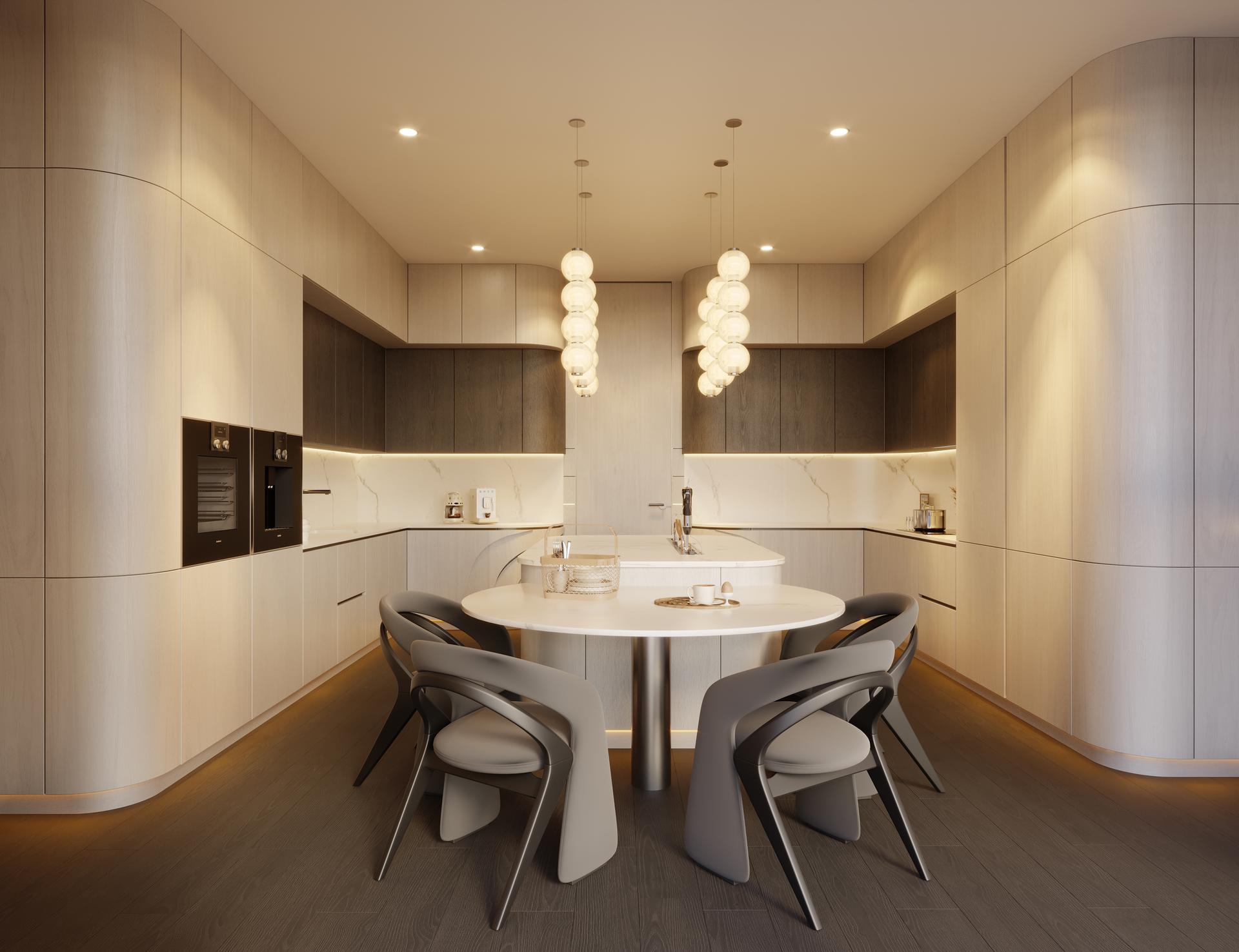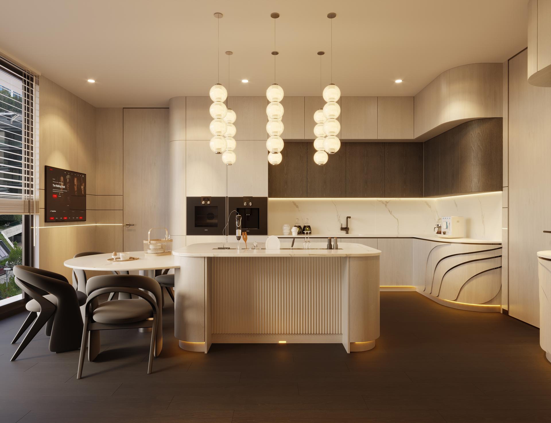 Mutfak: Sadece yemek pişirilen bir yer değil, evin tasarım objesi olarak kurgulanan mutfakta; organik formlu kavisli dolaplar, pürüzsüz lake yüzeyler ve gizli detaylarla fonksiyonellik sanatla buluşturuldu.